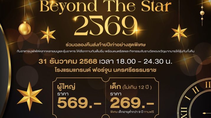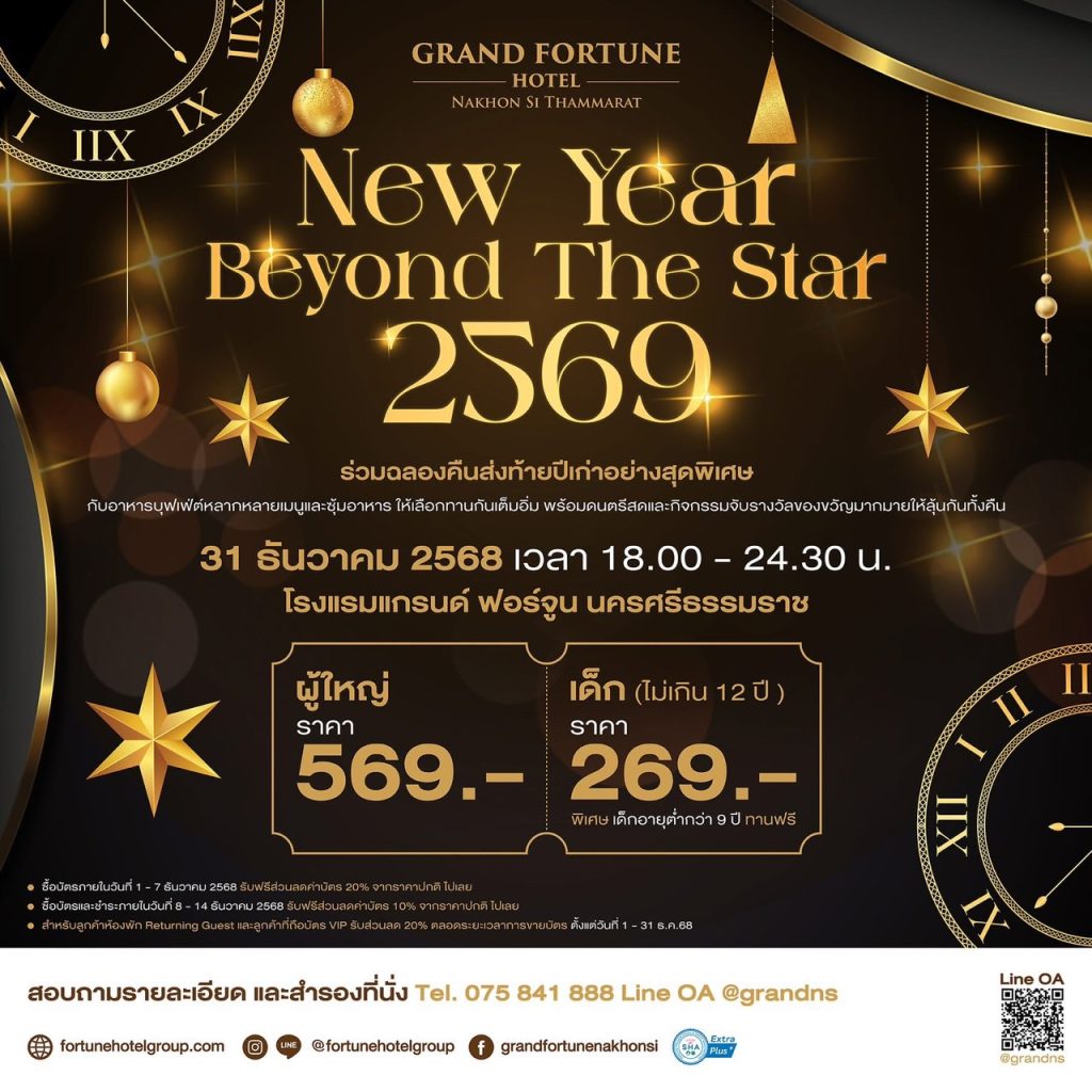 เริ่มต้นที่ โรงแรมแกรนด์ฟอร์จูน นครศรีธรรมราช Grand Fortune Hotel Nakhon Si Thammarat ส่งโปรฯเด็ด New Year Beyond the Star 2569 ร่วมฉลองคืนส่งท้ายปีเก่า 31 ธันวาคม 2568 กับงาน “New Year Beyond the Star 2569” เพลิดเพลินกับบุฟเฟ่ต์อาหารนานาชาติและซุ้มอาหารหลากหลายเมนู พร้อมดนตรีสด กิจกรรมบันเทิง และลุ้นรับของรางวัลตลอดค่ำคืน