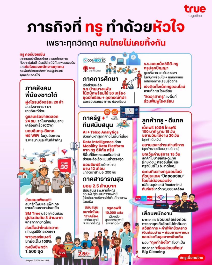 ในช่วงสถานการณ์ที่ผ่านมา ทรู ได้ดำเนิน “ภารกิจแห่งหัวใจ” เร่งฟื้นฟูและเยียวยาผู้ประสบอุทกภัยที่หาดใหญ่อย่างครอบคลุม ทั้งด้านการศึกษา คืนอนาคตเด็กไทยที่โรงเรียนบ้านบางแฟ่บและโรงเรียนเครือข่ายรวม 18 แห่ง ผ่านการมอบโน้ตบุ๊ก สื่อดิจิทัลและฟื้นฟูอาคารเพื่อให้การเรียนการสอนดำเนินการต่อได้ทันที ด้านเทคโนโลยีและนวัตกรรม นำศักยภาพ AI และ Mobility Data สนับสนุนภาครัฐวิเคราะห์พิกัดกู้ภัยและวางแผนอพยพ พร้อมส่งฝูงโดรนอัจฉริยะ 20 ลำ ขนส่งยาและอาหารในพื้นที่ที่เข้าถึงยาก ควบคู่ไปกับการรักษาเสถียรภาพเครือข่ายตลอด 24 ชั่วโมง พร้อมนำรถชุมสายเคลื่อนที่เร็ว (COW) เสริมสัญญาณในพื้นที่น้ำท่วม ด้านการดูแลลูกค้า ยกเว้นค่าบริการสำหรับลูกค้ามือถือ ทรูออนไลน์ และทรูวิชั่นส์ พร้อมขยายวันใช้งานและขยายเวลาชำระค่าบริการ มอบซิมทรู–ดีแทค และ WiFi ฟรี ในศูนย์อพยพ รพ.สนาม ทั้งยังระดมช่างทรูออนไลน์จากทั่วประเทศทำภารกิจ “ปิดซอยซ่อม” ลงพื้นที่เปลี่ยนอุปกรณ์โมเด็มถึงบ้านลูกค้าครบ 100% โดยไม่ต้องรอให้ลูกค้าแจ้ง ตลอดจนส่งต่อกำลังใจผ่านการบริจาคเงินและถุงยังชีพ นอกจากนี้ยังสนับสนุนบุคลากรทางการแพทย์และผู้ทำงานด้านสาธารณสุขด้วยส่วนลดสมาร์ทโฟนและแพ็กเกจราคาพิเศษ เพื่อเป็นพลังสำคัญในการขับเคลื่อนให้หาดใหญ่กลับมาเข้มแข็งอีกครั้ง