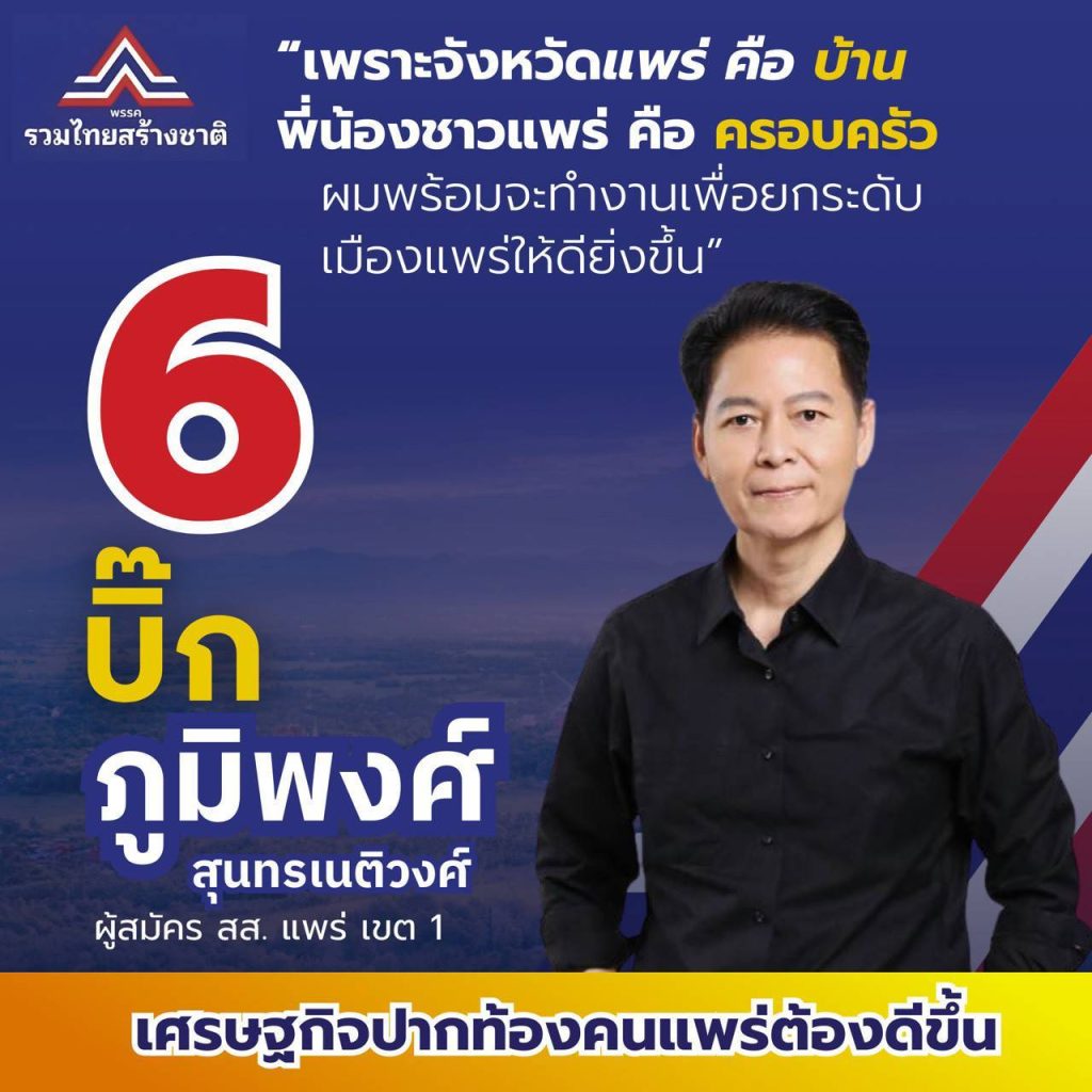 นายภูมิพงศ์ สุนทรเนติวงศ์ (บิ๊ก) ผู้สมัครสมาชิกสภาผู้แทนราษฎร หมายเลข 6 พรรครวมไทยสร้างชาติ เขต 1 จังหวัดแพร่ และปาร์ตี้ลิสต์พรรค เบอร์ 6 ภายใต้การนำของ นายพีระพันธ์ุ สาลีรัฐวิภาค แคนดิเดตนายกรัฐมนตรี อันดับที่ 1