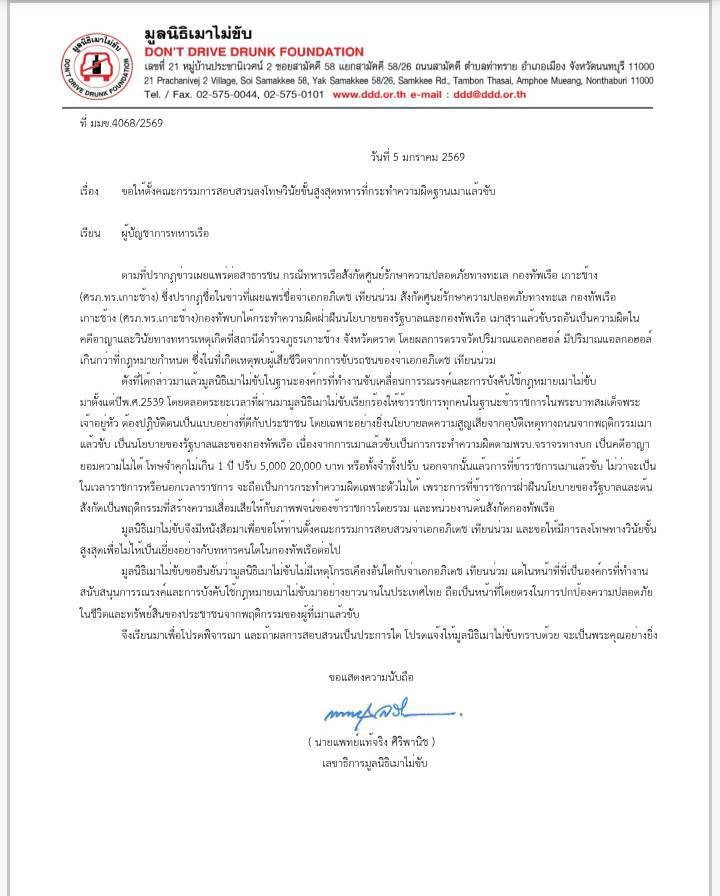 เมื่อวันที่ 5 ม.ค.2569 ผู้สื่อข่าวรายงานว่า นายแพทย์แท้จริง ศิริพานิช เลขาธิการมูลนิธิเมาไม่ขับ ได้ทำหนังสือร้องเรียนถึงผู้บัญชาการทหารเรือ