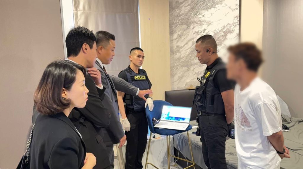 เจ้าหน้าที่ตำรวจ กก.1 บก.ปอท. ชุดจับกุมประกอบด้วย พ.ต.ท.เอกพล แสงอรุณ, พ.ต.ท.ธีรภพ พันธุชาติ รอง ผกก.1 บก.ปอท., พ.ต.ท.ณัฐวุฒิ มาระตา รอง ผกก.(สอบสวน) กก.1 บก.ปอท., พ.ต.ท.หญิง หทัยชนก อินทรวิจิตร, พ.ต.ต.กษิดิศ ดิลกคุณานันท์ สว.กก.1 บก.ปอท., ร.ต.อ.ทัศพงษ์ ผ่องใส, ร.ต.อ.ปฏิญญา สงวนศักดิ์เกษร รอง สว.กก.1 บก.ปอท., ด.ต.พีรวุฒิ โชติช่วง, ด.ต.พงศ์เทพ เลิศพิภพ, ด.ต.หญิง วาสนา ภารา, จ.ส.ต.กฤติเดช หอละเอียด, จ.ส.ต.ปิติภัทร พวงสมบัต ผบ.หมู่ กก.1 บก.ปอท ร่วมกับ เจ้าหน้าที่แผนกกงสุลตำรวจสถานเอกอัครราชทูตสาธารณรัฐเกาหลีประจำประเทศไทย, เจ้าหน้าที่ตำรวจ กลุ่มงานสนับสนุนฯ บก.ปอท. และเจ้าพนักงานตำรวจ กก.สืบสวน บก.ตม.