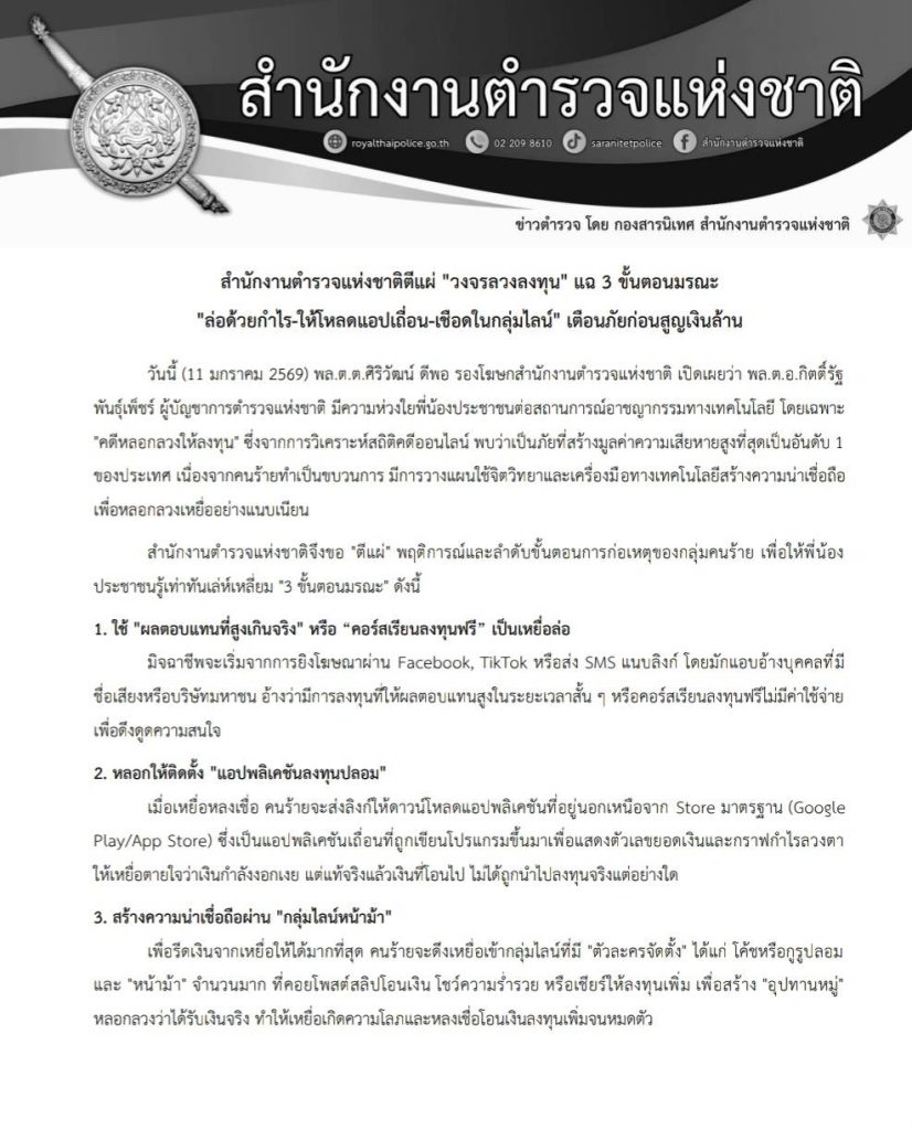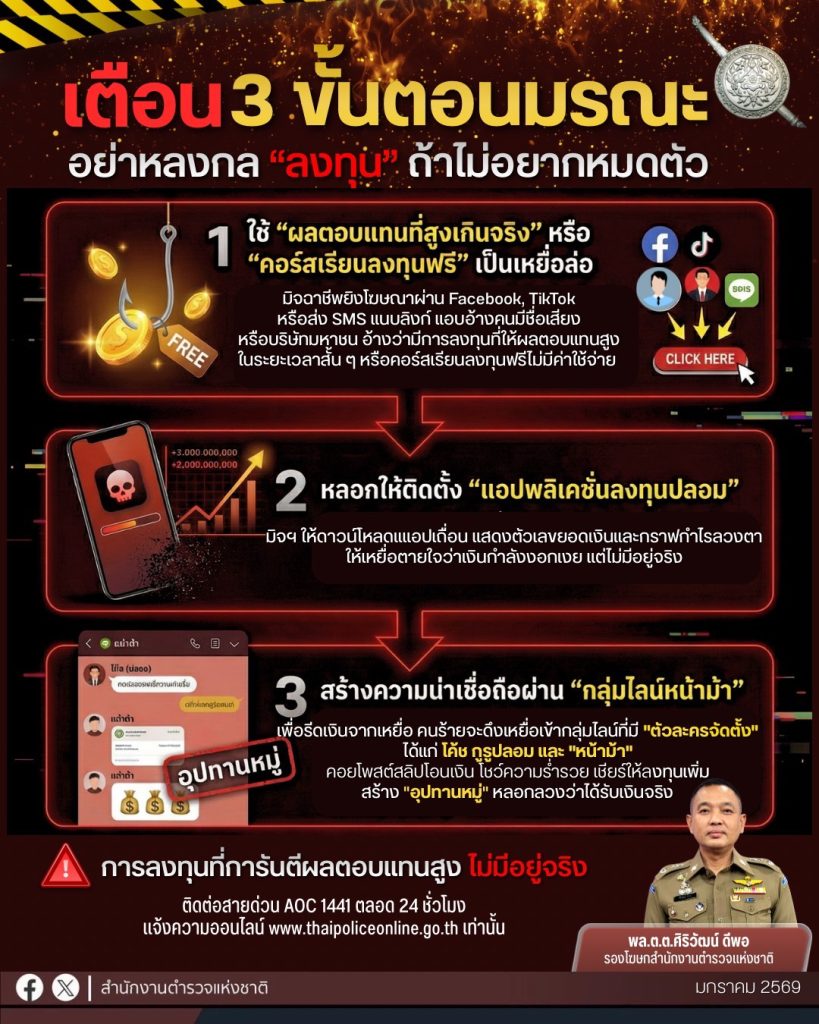 สำนักงานตำรวจแห่งชาติตีแผ่ “วงจรลวงลงทุน” แฉ 3 ขั้นตอนมรณะ “ล่อด้วยกำไร-ให้โหลดแอปเถื่อน-เชือดในกลุ่มไลน์” เตือนภัยก่อนสูญเงินล้าน