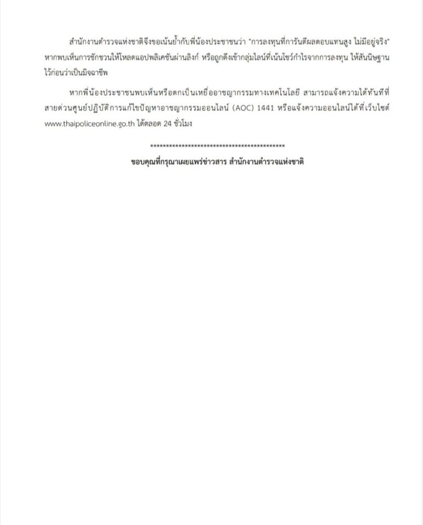 สำนักงานตำรวจแห่งชาติจึงขอเน้นย้ำกับพี่น้องประชาชนว่า “การลงทุนที่การันตีผลตอบแทนสูง ไม่มีอยู่จริง” หากพบเห็นการชักชวนให้โหลดแอปพลิเคชันผ่านลิงก์ หรือถูกดึงเข้ากลุ่มไลน์ที่เน้นโชว์กำไรจากการลงทุน ให้สันนิษฐานไว้ก่อนว่าเป็นมิจฉาชีพ
