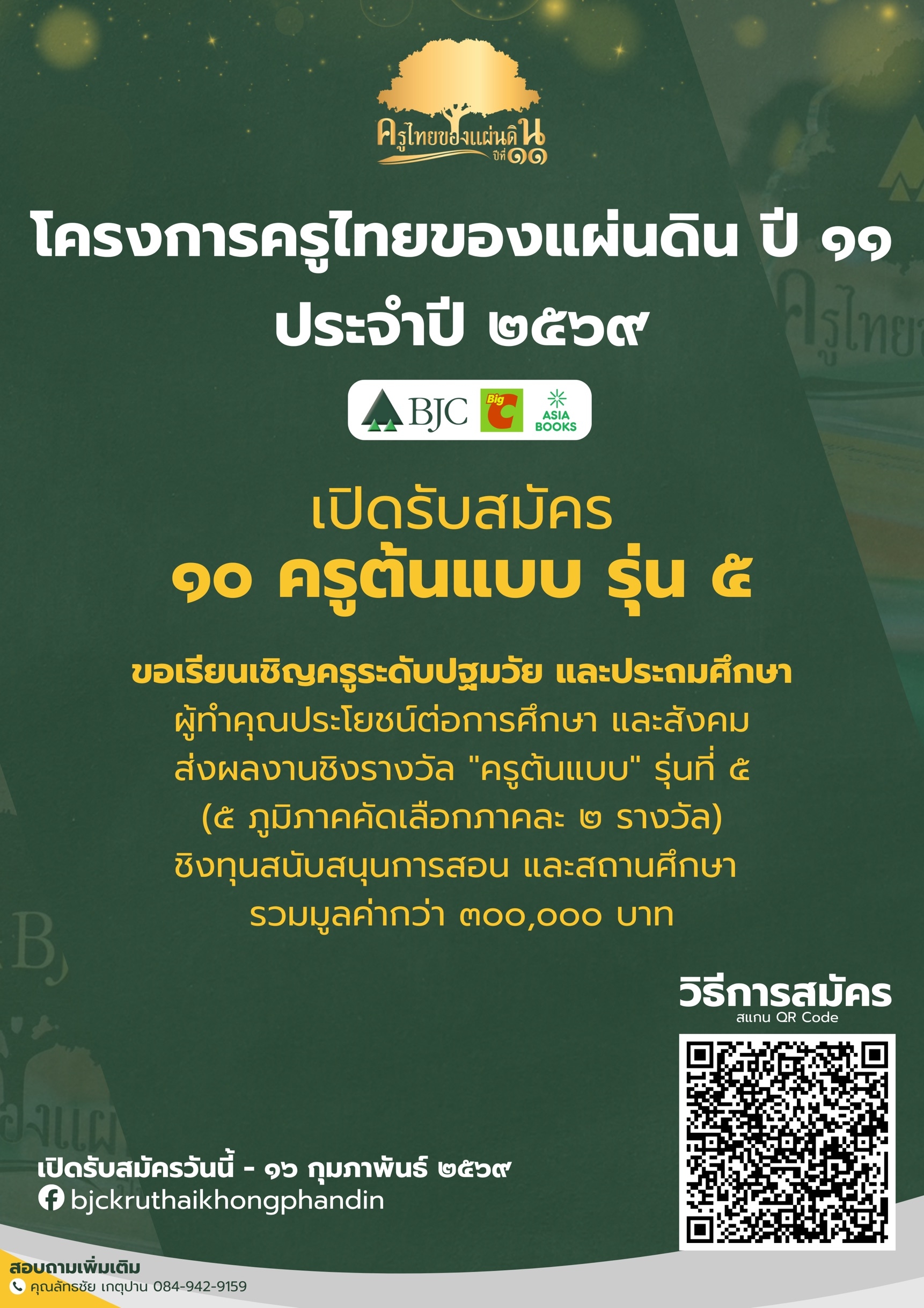- ประกาศผลรอบ 30 ท่านสุดท้าย: ต้นเดือนมีนาคม 2569 ผ่านทาง Facebook Page: บีเจซีครูไทยของแผ่นดิน