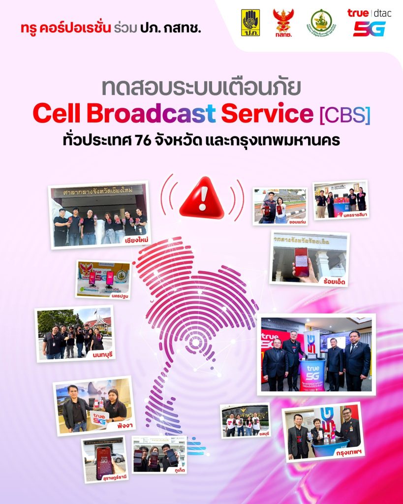 กรุงเทพฯ 20 มกราคม 2569 บริษัท ทรู คอร์ปอเรชั่น จำกัด (มหาชน) ร่วมกับ กรมป้องกันและบรรเทาสาธารณภัย (ปภ.) และสำนักงานคณะกรรมการกิจการกระจายเสียง กิจการโทรทัศน์และกิจการโทรคมนาคมแห่งชาติ (กสทช.) ประกาศความสำเร็จทดสอบระบบแจ้งเตือน “Cell Broadcast Service” ทั่วประเทศครั้งแรกของไทย ยืนยันศักยภาพของระบบที่สามารถส่งข้อความแจ้งเตือนภัยไปยังโทรศัพท์มือถือของประชาชนครอบคลุมทั่วประเทศทั้ง 76 จังหวัดและกรุงเทพมหานคร พร้อมยกระดับการเตือนภัยไปอีกขั้นผ่านหน้าจอโทรทัศน์สำหรับผู้ชมผ่านกล่องทรูไอดีทีวี ตอบโจทย์การเข้าถึงประชาชนได้ครบทุกกลุ่มเป้าหมาย สะท้อนศักยภาพของเทคโนโลยีการสื่อสารที่พร้อมรองรับสถานการณ์ฉุกเฉินจริง เพื่อเสริมสร้างคุณภาพชีวิตและความปลอดภัยของคนไทยทุกคน