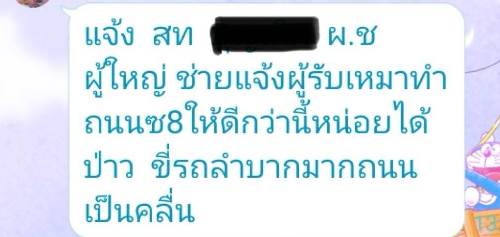 ผู้สื่อข่าวรายงานว่า ที่หมู่ 6 หนองเสือ ซอย 8 ตำบลกรับใหญ่ อำเภอบ้านโป่ง จังหวัดราชบุรี ได้มีผู้รับเหมา ช่างทำถนน เข้ามาดำเนินการรื้อถนนเก่าออกตลอดทั้งเส้นทาง โดยที่ชาวบ้านไม่รู้ล่วงหน้ามาก่อน ว่าจะมีช่างเข้ามารื้อทำถนน จึงทำให้สัญจรไปมาลำบาก ถนนเป็นหลุม เป็นบ่อ และเป็นขี้เลน รวมถึงเวลารถแล่นผ่าน ฝุ่นละอองจากถนนปลิวเข้าบ้านเรือนเดือดร้อนกันทั้งซอย เสื้อผ้าที่ตากไว้ โดนฝุ่นจับแดงเถือก ต้องซักใหม่หลายรอบ ตอนนี้ไม่สามารถตากเสื้อผ้าได้ รวมถึงผู้รับเหมาดันมาทำท่อประปาแตกหัก เสียหาย ทำให้เดือดร้อนหนักเข้าไปอีก ยิ่งตอนนี้ไม่มีน้ำใช้ อุปโภคและดำเนินการในชีวิตประจำวัน