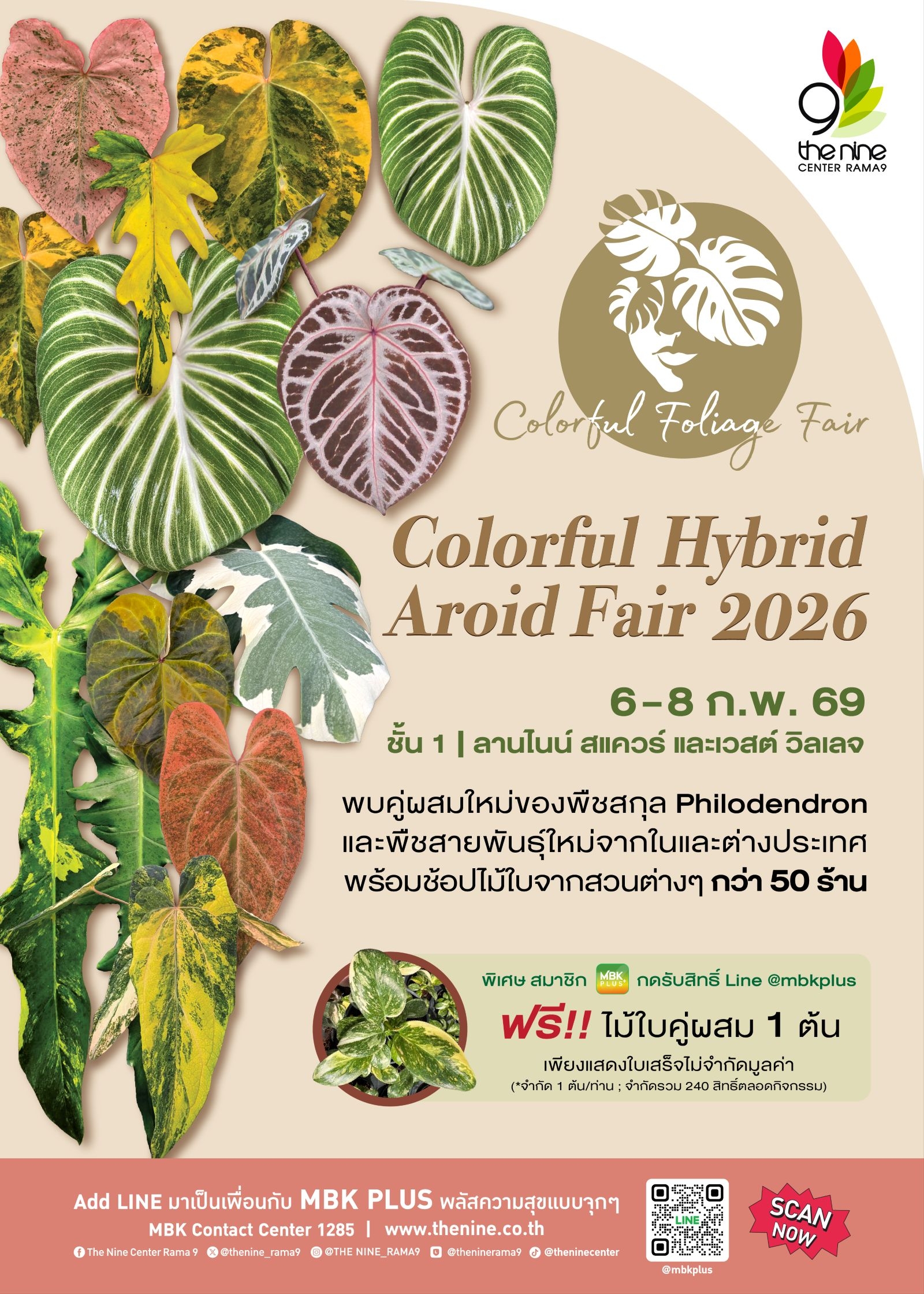 เดอะไนน์ เซ็นเตอร์ พระราม 9 ศูนย์การค้าเครือเอ็ม บี เค เอาใจคนรักไม้ใบ ไม้ด่าง ชวนมาเลือกช้อปไม้ใบในงาน Colorful Foliage ครั้งที่ 7 ในธีม Colorful Hybrid Aroid Fair 2026 งานจัดแสดงสายพันธุ์ใหม่และคู่ผสมใหม่ๆ ของพืชสกุล Philodendron ถ่ายทอดความงดงามของการพัฒนาและความหลากหลายทาง พันธุกรรม ผ่านการคัดสรรสายพันธุ์พิเศษที่เกิดจากการผสมผสานอย่างตั้งใจ