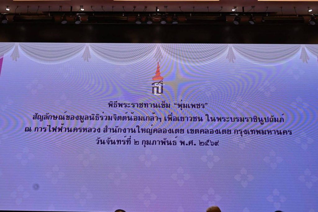 (2 ก.พ. 2569) เวลา 09.42 น. สมเด็จพระกนิษฐาธิราชเจ้า กรมสมเด็จพระเทพรัตนราชสุดา ฯ สยามบรมราชกุมารี เสด็จพระราชดำเนินไปยังห้องประชุมชั้น 12 เอ อาคารสันทนาการ การไฟฟ้านครหลวง สำนักงานใหญ่ เขตคลองเตย กรุงเทพมหานคร ในการพระราชทานเข็ม “พุ่มเพชร” แก่ผู้ดำเนินงานมูลนิธิร่วมจิตต์น้อมเกล้า ฯ เพื่อเยาวชน ในพระบรมราชินูปถัมภ์ ของจังหวัดและกรุงเทพมหานคร โดยมี นายบวรศักดิ์ อุวรรณโณ รองนายกรัฐมนตรี นางสาวศศิธร กิตติธรกุล รัฐมนตรีช่วยว่าการกระทรวงมหาดไทย นายอรรษิษฐ์ สัมพันธรัตน์ ปลัดกระทรวงมหาดไทย นางจิณณารัชช์ สัมพันธรัตน์ นายกสมาคมแม่บ้านมหาดไทย พร้อมด้วยผู้บริหารกระทรวงมหาดไทย สมาคมแม่บ้านมหาดไทย ผู้ว่าราชการจังหวัด ประธานแม่บ้านมหาดไทยจังหวัด คณะกรรมการมูลนิธิร่วมจิตต์น้อมเกล้า ฯ เพื่อเยาวชน ในพระบรมราชินูปถัมภ์ ผู้บริหารการไฟฟ้านครหลวง ข้าราชการ พนักงาน เจ้าหน้าที่ กระทรวงมหาดไทย และผู้สนับสนุนการดำเนินงานมูลนิธิร่วมจิตต์น้อมเกล้า ฯ เพื่อเยาวชน ในพระบรมราชินูปถัมภ์ เฝ้าทูลละอองพระบาทรับเสด็จ
