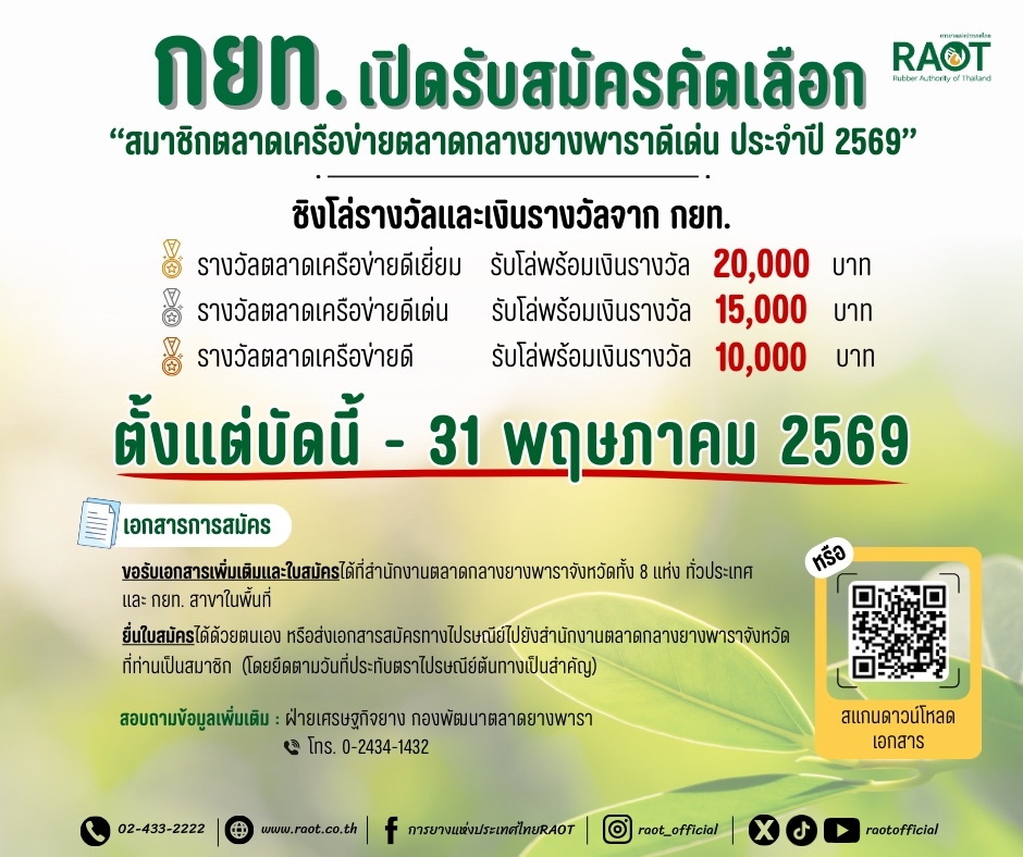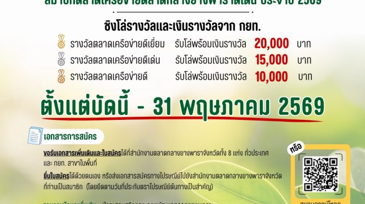 การยางแห่งประเทศไทย (กยท.) โดยฝ่ายเศรษฐกิจยาง เปิดรับสมัครคัดเลือก “สมาชิกตลาดเครือข่ายตลาดกลางยางพาราดีเด่น ประจำปี 2569” ชวนเครือข่ายตลาดยางพารากว่า 500 แห่ง ทั่วประเทศ เข้าประชันศักยภาพ ดันตลาดยางเครือข่ายสู่ตลาดยุคใหม่ที่มีประสิทธิภาพ โปร่งใส เป็นธรรม เป็นมิตรต่อสิ่งแวดล้อม สมัครได้ตั้งแต่วันนี้ – 31 พฤษภาคม 2569