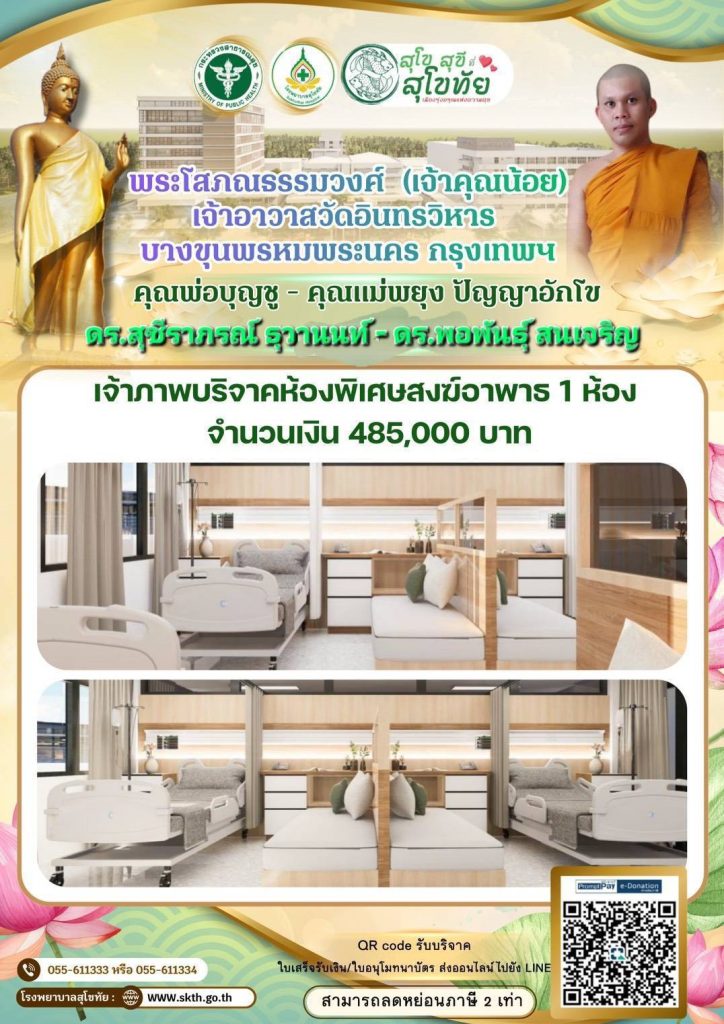 การบริจาคในครั้งนี้มีวัตถุประสงค์เพื่อจัดสร้าง ห้องพิเศษสงฆ์อาพาธ จำนวน 1 ห้อง สำหรับใช้ดูแลพระภิกษุสงฆ์ที่อาพาธ โดยมียอดเงินบริจาครวมทั้งสิ้น 485,000 บาท ซึ่งทางโรงพยาบาลสุโขทัยเป็นผู้รับมอบอย่างเป็นทางการ