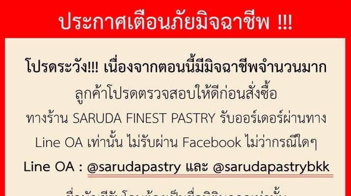 ทาง SARUDA FINEST PASTRY ขอชี้แจงว่า ร้านไม่มีส่วนเกี่ยวข้องใด ๆ กับ Facebook Page ปลอมดังกล่าว และขอความร่วมมือลูกค้าทุกท่านหลีกเลี่ยงการติดต่อ การทำธุรกรรม หรือการคลิกลิงก์โฆษณาใด ๆ ที่เผยแพร่ผ่านเพจปลอมดังกล่าวโดยเด็ดขาด