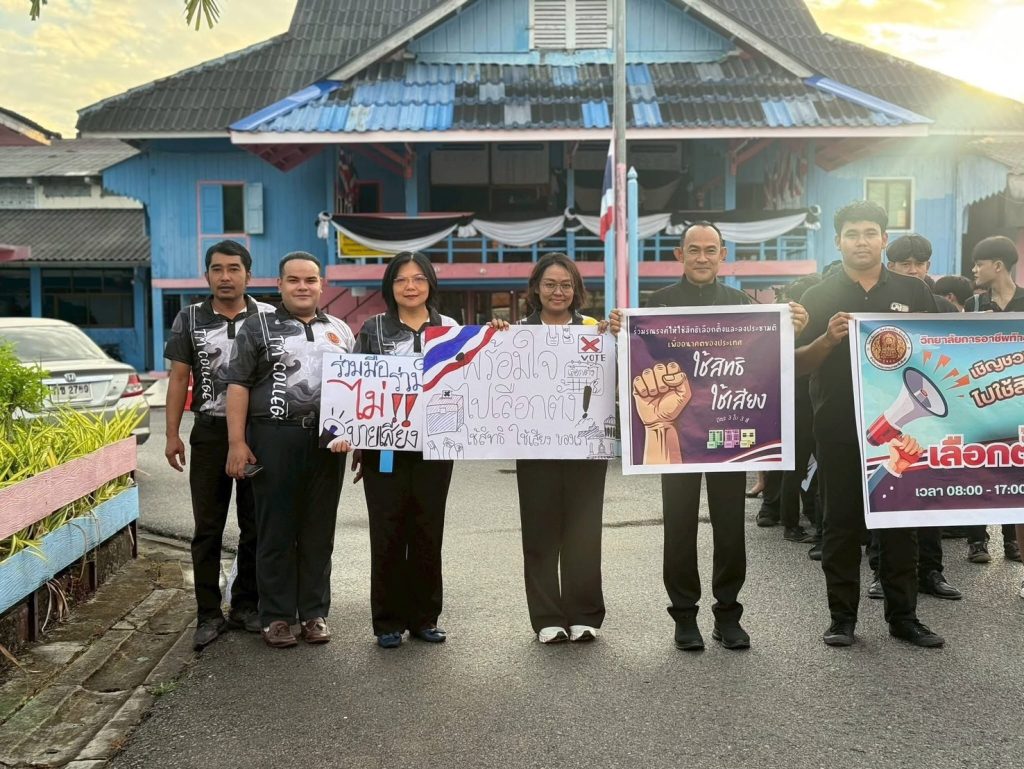 เมื่อวันที่ 6 ก.พ.69 ที่วิทยาลัยการอาชีพท้ายเหมือง อ.ท้ายเหมือง จ.พังงา นายศุภชัย จันทร์ประดิษฐ์ ผอ.วิทยาลัยการอาชีพท้ายเหมือง พร้อมคณะผู้บริหาร อาจารย์ และนักศึกษาร่วมจัดกิจกรรมเดินรณรงค์ให้ประชาชนออกไปใช้สิทธิ์เลือกตั้งในวันที่ 8 ก.พ.69 ที่จะถึงนี้