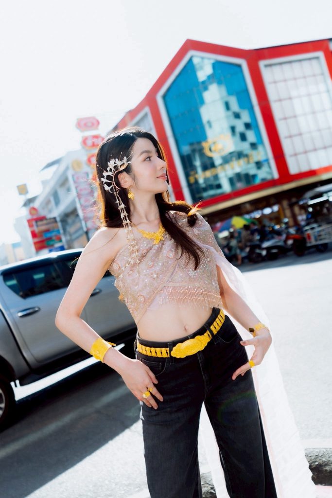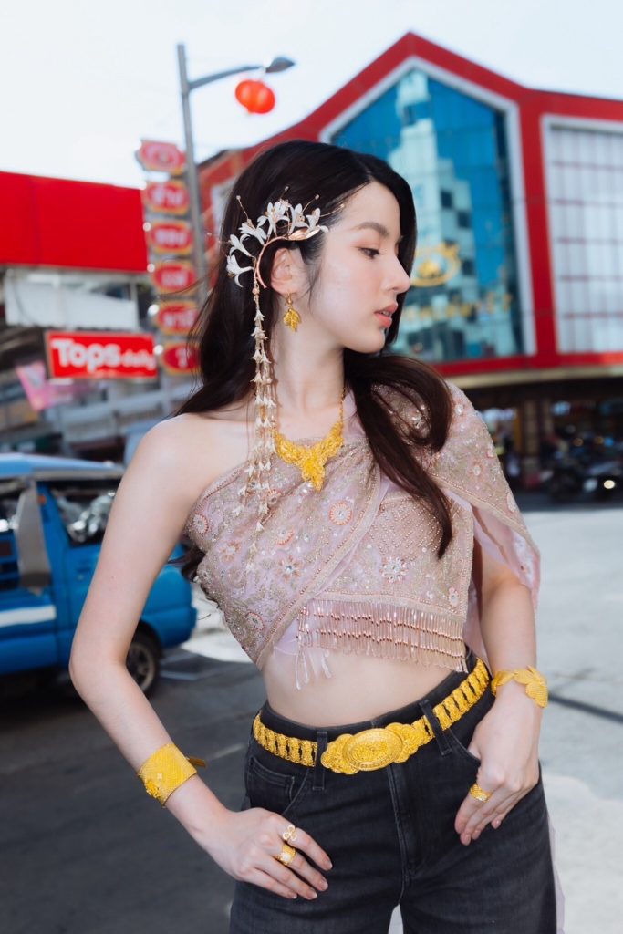 ลุคนี้สะท้อนภาพความเป็นไทยร่วมสมัย ผสมความหรูของทองคำกับสตรีทแฟชั่น ให้เห็นว่าทองไม่ได้อยู่แค่ในตู้โชว์ แต่สามารถเป็นแฟชั่นและตัวตนของคนรุ่นใหม่ได้