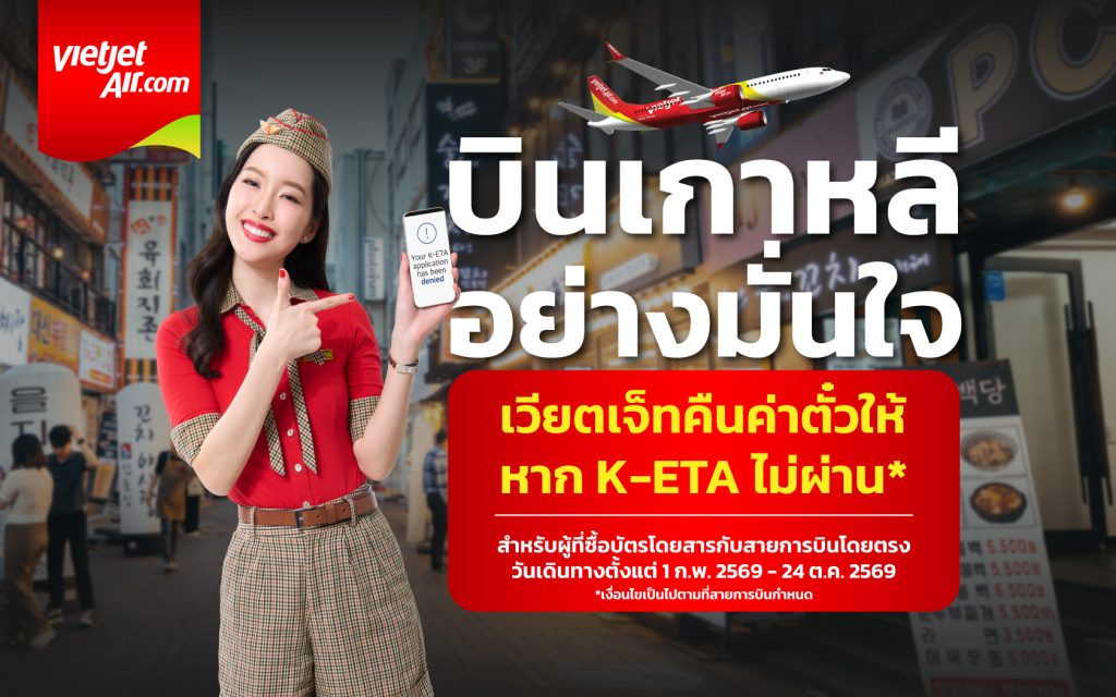 (กรุงเทพฯ, 28 มกราคม 2569) – เวียตเจ็ทไทยแลนด์ เปิดตัวบริการใหม่ “K-ETA Refund & Credit Shell” เพื่ออำนวยความสะดวกและเพิ่มความมั่นใจให้กับผู้โดยสารที่เดินทางสู่ประเทศเกาหลีใต้ โดยผู้โดยสารสามารถเลือกขอรับเงินคืน หรือเก็บมูลค่าบัตรโดยสารในรูปแบบ Credit Shell ได้ ในกรณีที่การยื่นขอ Korea Electronic Travel Authorization (K-ETA) ไม่ได้รับการอนุมัติ ทั้งนี้ บริการดังกล่าวช่วยให้ผู้โดยสารวางแผนการเดินทางได้อย่างมั่นใจยิ่งขึ้น พร้อมเพิ่มความยืดหยุ่นและความอุ่นใจตลอดการเดินทาง