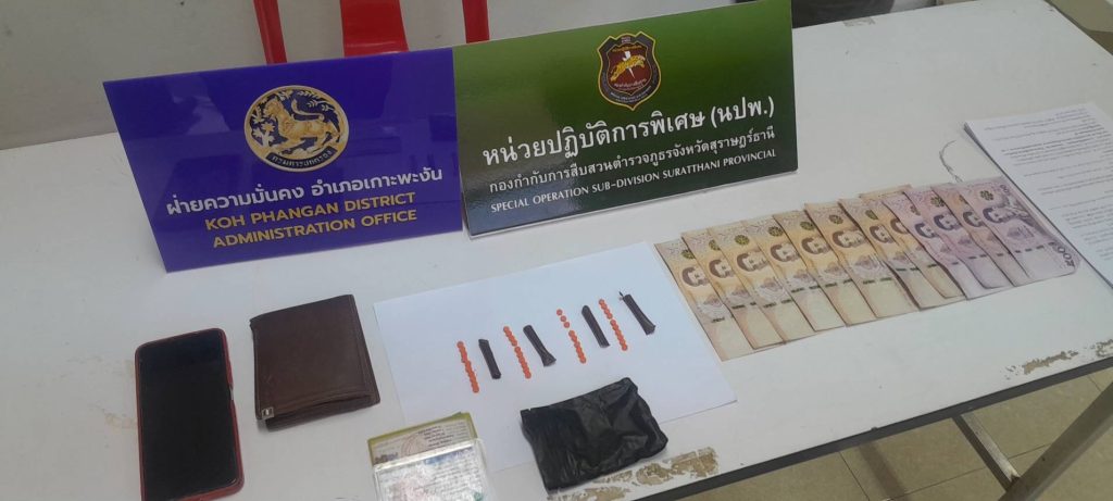นาย Myo Aung อายุ 32 ปี สัญชาติเมียนมา พร้อมยาบ้า จำนวน 40 เม็ด เงินสดจำนวน 10,000 บาท ทั้งนี้สืบเนื่องจากเจ้าหน้าที่ชุดจับกุมสืบทราบว่านาย Myo Aung ผู้ต้องหามีพฤติการณ์จำหน่ายยาบ้าให้กับนักเสพสัญชาติเดียวกันจึงได้ทำการจับกุมขณะเข้าจับกุมตัว นาย Myo Aung พยายามจะหลบหนี แต่เจ้าหน้าที่สามารถติดตามจับกุมตัวมาได้ จากการตรวจค้นตัวพบได้ซุกซ่อนยาบ้าจำนวน 40 เม็ด บรรจุอยู่ในหลอดเครื่องดื่มซุกซ่อนอยู่ที่ขอบกางเกงชั้นในด้านหน้า สอบสวนผู้ต้องหารับสารภาพว่า ยาบ้าทั้งหมดเป็นของตนเองจริง และได้ลักลอบจำหน่ายให้กับกลุ่มแรงงานเมียนมาด้วยกัน ก่อนนำตัวส่งพนักงานสอบสวน สภ.เกาะพะงันดำเนินคดีในข้อหา”มียาเสพติดให้โทษประเภท๑ (เมทแอมเฟตามีน) ไว้ในครอบครองเพื่อจำหน่ายโดยเป็นการกระทำเพื่อการค้าและการก่อให้เกิดการแพร่กระจายในกลุ่มประชาชนและเสพยาเสพติดให้โทษประเภท ๑ (เมทแอมเฟตามึน)โดยผิดกฎหมาย”