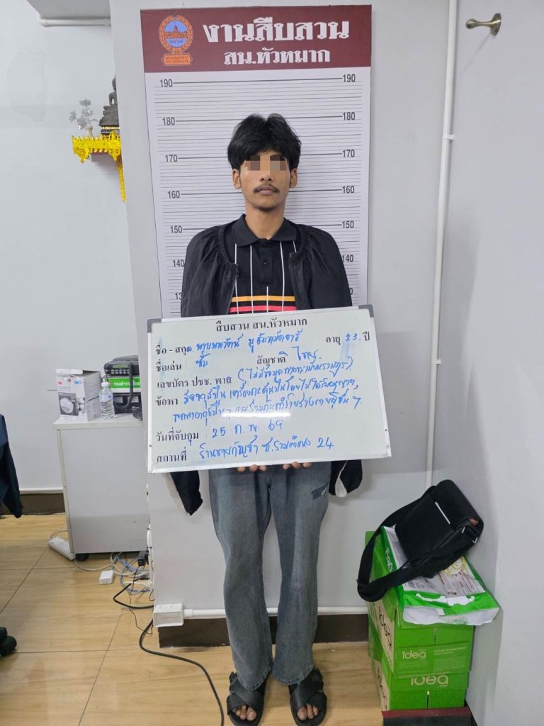 รอง สว.สส.สน.หัวหมาก พร้อมกำลังเจ้าหน้าที่ตำรวจฝ่ายสืบสวนสน.หัวหมาก ได้ร่วมกันจับกุม