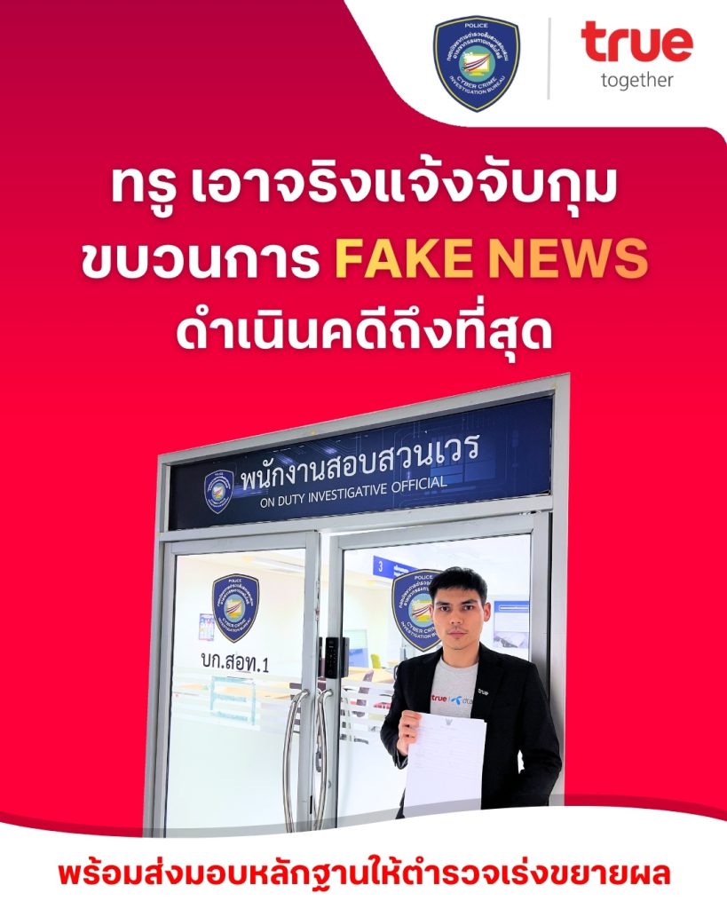 ทรูเอาจริง ล่าตัวมือป่วนบนโซเชียล! เข้าแจ้งความตำรวจไซเบอร์ (บช.สอท.1) ดำเนินคดีกลุ่มบัญชีโซเชียลสร้างเฟคนิวส์ ใช้ AI ผลิตภาพบิดเบือน ให้ข้อมูลเท็จสร้างความเข้าใจผิดกระทบต่อความเชื่อมั่นของสาธารณะ พร้อมส่งมอบหลักฐานเร่งขยายผลเอาผิดผู้กระทำผิดถึงที่สุด