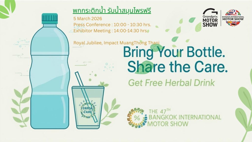 บริษัท กรังด์ปรีซ์ อินเตอร์เนชั่นแนล จำกัด (มหาชน) ในฐานะผู้นำการจัดงาน“บางกอก อินเตอร์เนชั่นแนล มอเตอร์โชว์ ครั้งที่ 47” ประกาศเดินหน้าพันธกิจด้านสิ่งแวดล้อมอย่างต่อเนื่อง เป็นปีที่ 2 กับโครงการ“พกกระติกน้ำ รับน้ำสมุนไพรฟรี” หลังได้รับผลตอบรับอย่างดีเยี่ยมในปีที่ผ่านมา เพื่อรณรงค์ลดขยะพลาสติกและสร้างวัฒนธรรมการบริโภคที่ยั่งยืนภายใต้กรอบแนวคิด ESG (Environmental, Social, and Governance) ในงานแถลงข่าว และประชุมผู้เข้าร่วมออกงาน (Exhibitor Meeting) ยังคงมุ่งเน้นสร้างการมีส่วนร่วมในการรณรงค์ลดขยะ โดยส่งเสริมให้สื่อมวลชน ผู้เข้าร่วมออกงาน คณะทำงาน พกพากระติกน้ำหรือภาชนะส่วนตัวเพื่อลดการใช้บรรจุภัณฑ์แบบใช้ครั้งเดียวทิ้ง (Single-use Plastic) มาเติมเครื่องดื่มน้ำสมุนไพรเพื่อสุขภาพฟรี ณ จุดบริการบริเวณหน้าห้องแถลงข่าว ในวันที่ 5 มีนาคม 2569 ณ ห้องรอยัล จูบิลี่ อิมแพ็ค เมืองทองธานี