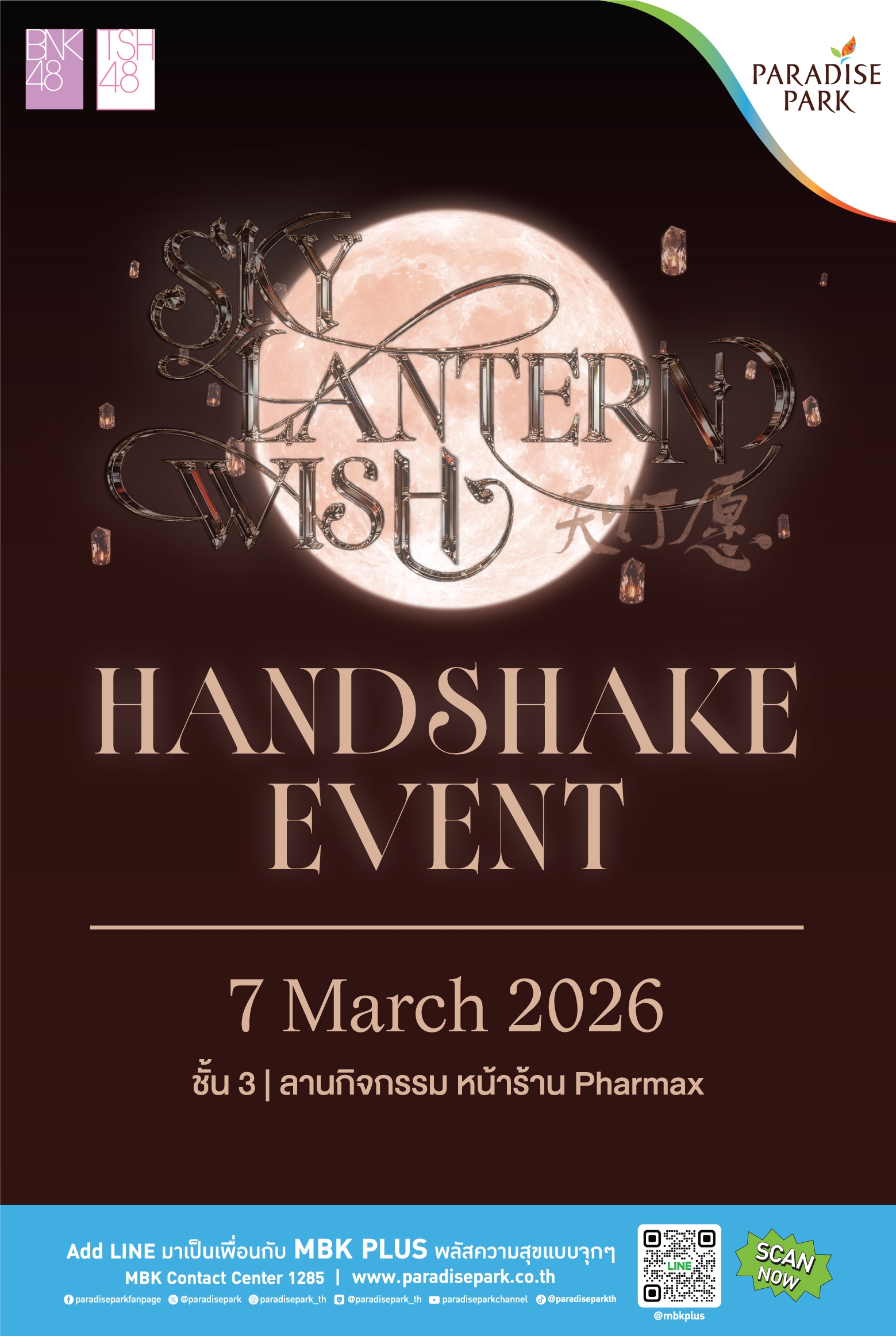 มาร่วมเป็นส่วนหนึ่งของโมเมนต์สุดประทับใจ และเก็บความทรงจำดี ๆ ไปพร้อมกัน ในงาน BNK48 & TSH48 Special Single “Sky Lantern Wish” Handshake Event ในวันเสาร์ที่ 7 มีนาคม 2569 ตั้งแต่เวลา 12.00 น. – 19.00 น. ณ บริเวณชั้น 3 ลานกิจกรรม ข้างร้าน Pharmax ศูนย์การค้าพาราไดซ์ พาร์ค