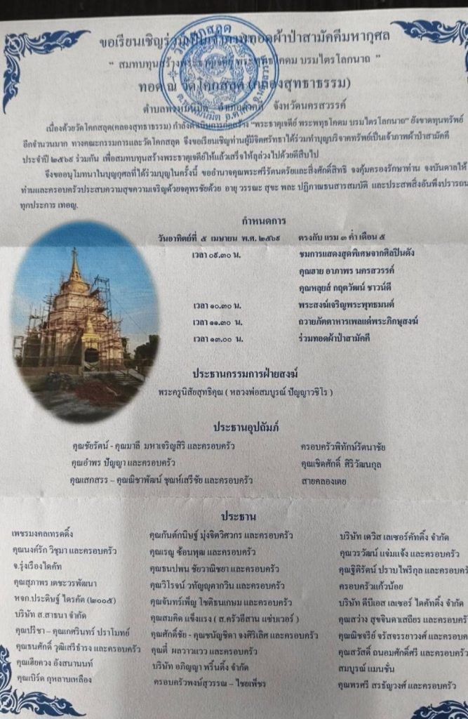 คุณพ่อชัยรัตน์ – คุณแม่มาลี มหาเจริญสิริ” เชิญร่วมทอดผ้าป่าสามัคคีมหากุศล สมทบทุนสร้างพระธาตุเจดีย์พระพุทธโคดมบรมไตรโลกนาถ ณ วัดโคกสลุด อ.ตาคลี จ.นครสวรรค์