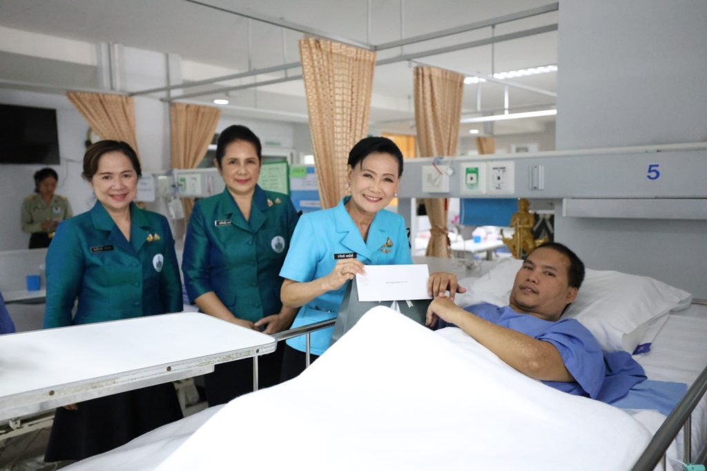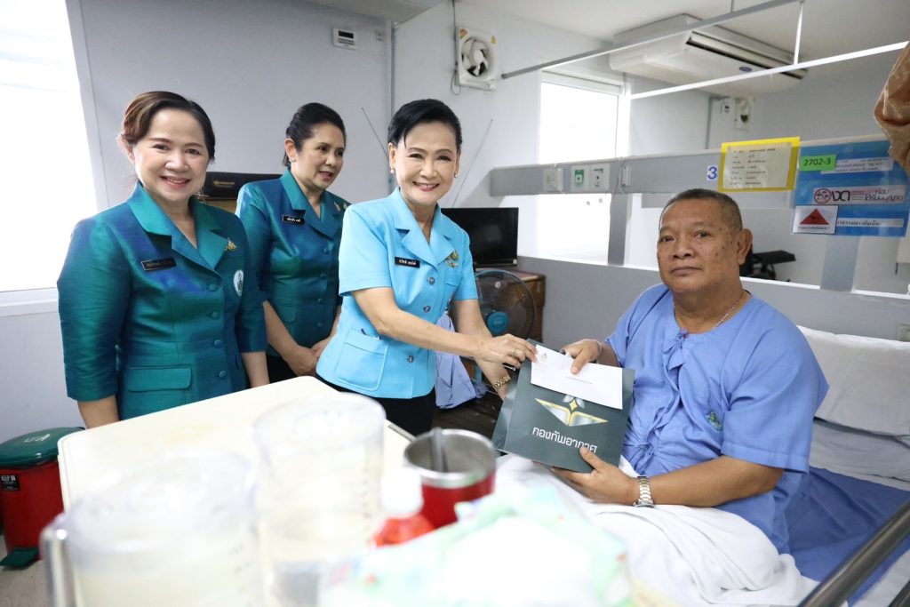 จากนั้น คณะได้เข้าเยี่ยมผู้ป่วยทหารผ่านศึกที่พักรักษาตัว พร้อมมอบของเยี่ยมและเงินบำรุงขวัญ เพื่อสร้างกำลังใจและแสดงความห่วงใย ณ หอผู้ป่วย อาคาร 2 ชั้นที่ 3, 4 และ 7 ของโรงพยาบาลทหารผ่านศึก