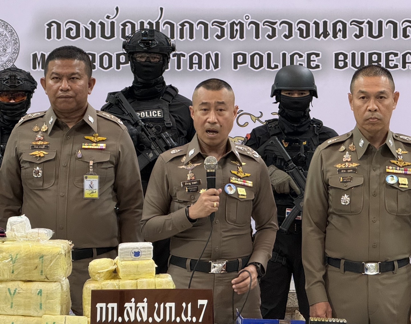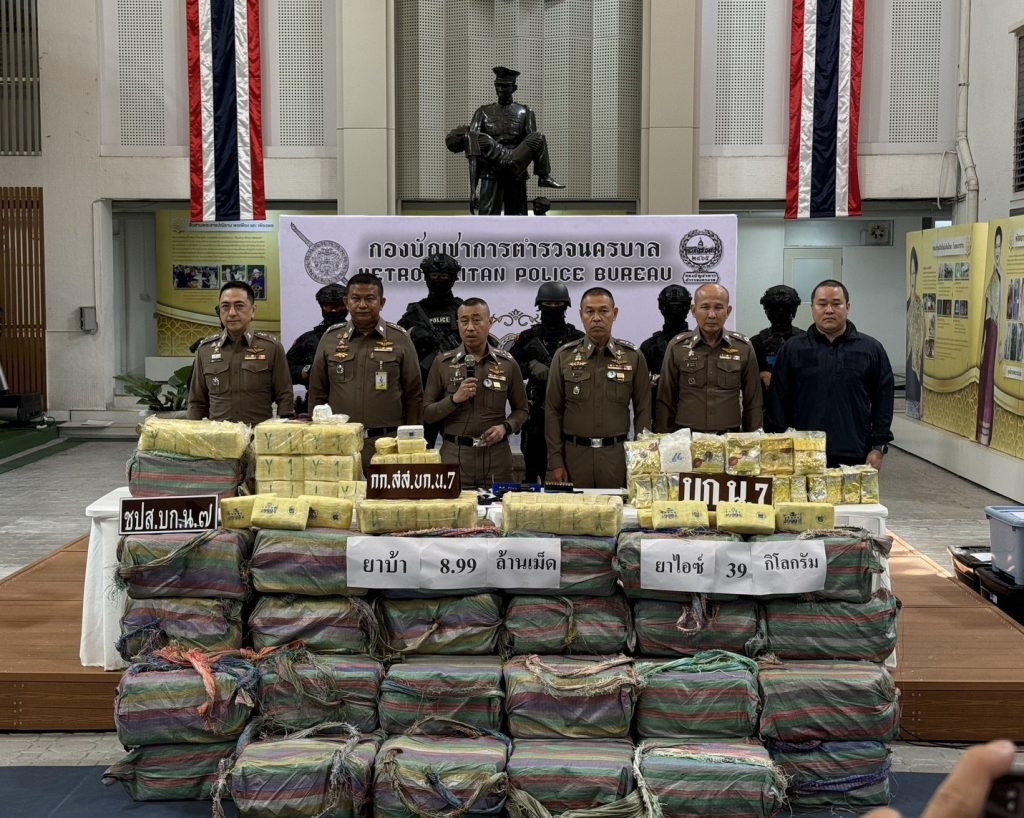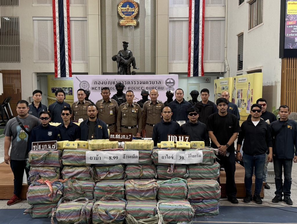 เมื่อวันที่ 9 มีนาคม 2569 ณ กองบัญชาการตำรวจนครบาล (บช.น.) พล.ต.อ.สำราญ นวลมา รอง ผบ.ตร. พร้อมด้วย พล.ต.ท.สยาม บุญสม ผู้บัญชาการตำรวจนครบาล พล.ต.ต.ธีรเดช ธรรมสุธีร์ รอง ผบช.น. พล.ต.ต.ชัยยะ เพ็ชรปัญญา ผบก.น.7 และ พ.ต.อ.อัษฎาวุธ ขวัญเมือง ผกก.สส.บก.น.7 แถลงผลงานชิ้นโบแดง หลังนำกำลังชุดสืบสวน บก.น.7 เข้าขยี้เครือข่ายค้ายารายใหญ่ จับกุม 3 ผู้ต้องหาหลัก ได้แก่ น.ส.รัฐกรานต์ (44 ปี), นายสุโรจน์ (48 ปี) และ นายอัคพล (44 ปี) พร้อมของกลางที่เห็นแล้วต้องตะลึง ยาบ้า 8.99 ล้านเม็ด ยาไอซ์ 39 กิโลกรัม อาวุธปืนปืนพกสั้น 3 กระบอก พร้อมกระสุน (เตรียมพร้อมสู้) ยานพาหนะ รถยนต์ 3 คัน (ใช้ลำเลียงและนำทาง)