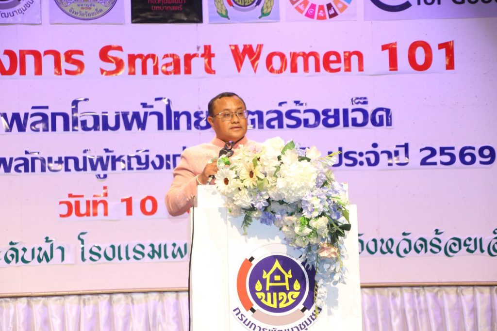 วันที่ 10 มีนาคม 2569 เวลา 09.30 น. ที่ห้องประดับฟ้า โรงแรมเพชรรัชต์การ์เด้น อำเภอเมืองร้อยเอ็ด จังหวัดร้อยเอ็ด จัดโครงการ “Smart Women 101 : พลิกโฉมผ้าไทยสไตล์ร้อยเอ็ด สร้างภาพลักษณ์ผู้หญิงเก่งและทันสมัย” เนื่องใน วันสตรีสากล ประจำปี 2569 โดยมี นายชัชวาลย์ เบญจสิริวงศ์ ผู้ว่าราชการจังหวัดร้อยเอ็ด เป็นประธานในพิธีเปิด พร้อมด้วย นางนวลจันทร์ ศรีมงคล ผู้ตรวจราชการกรมการพัฒนาชุมชน นางราณี วงศ์ลุน พัฒนาการจังหวัดร้อยเอ็ด หัวหน้าส่วนราชการ พัฒนาการอำเภอ คณะกรรมการพัฒนาสตรีจังหวัด และเครือข่ายสตรีจากทุกอำเภอเข้าร่วมกิจกรรมอย่างพร้อมเพรียง