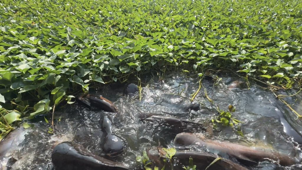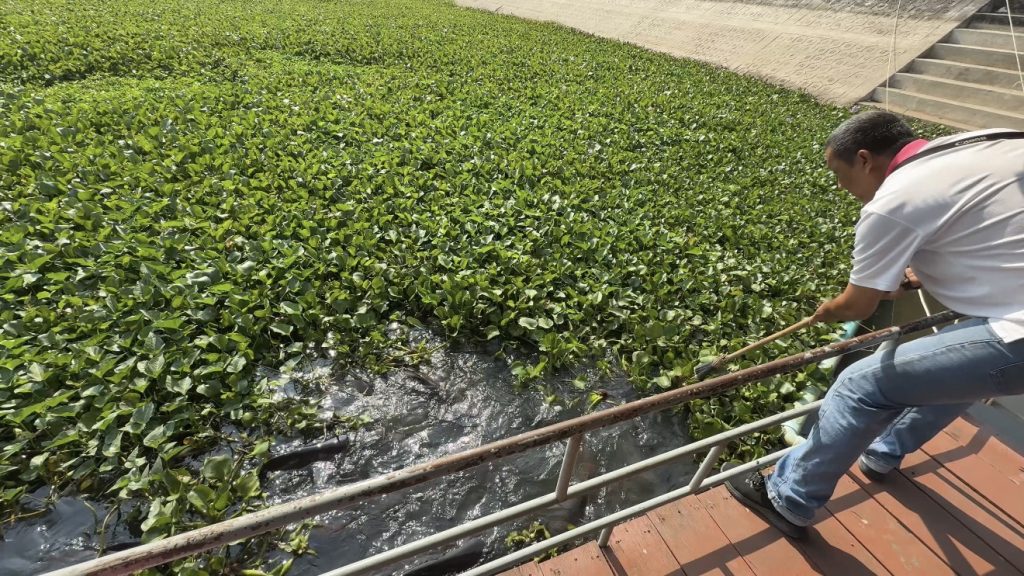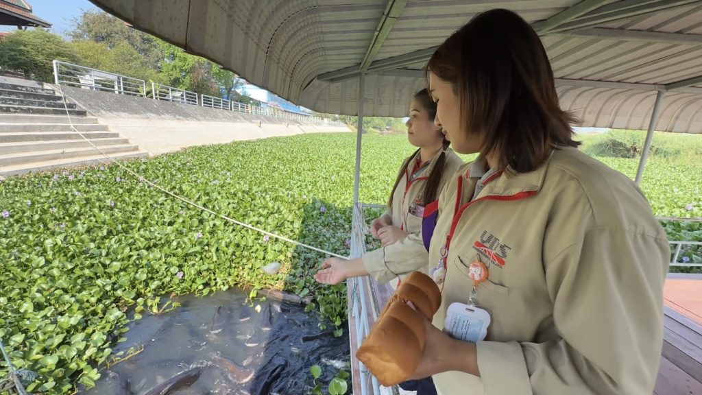 เมื่อโยนขนมปังเพื่อให้อาอาหารปลา พบว่ามีปลาสวาย ขนาดใหญ่น้ำหนักไม่ต่ำกว่า 10 กิโลกรัมจำนวนมาก ไม่สามารถขึ้นมารับอาหารได้ เนื่องจากผักตบชวาขึ้นปกคลุมผิวน้ำหนาแน่น เหลือเพียงช่องว่างเล็ก ๆ ให้ปลาโผล่ขึ้นมาหายใจ