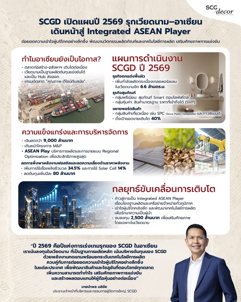 SCGD เปิดแผนธุรกิจ ปี 2569 รุกเร่งขยายเวียดนาม–อาเซียน สู่การเป็นผู้เล่นวัสดุตกแต่งพื้นผิวและสุขภัณฑ์ระดับภูมิภาคครบวงจร