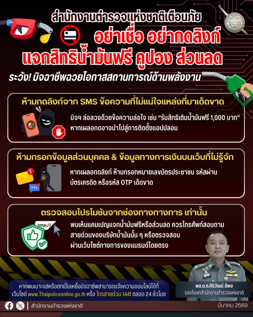 วันนี้ (16 มีนาคม 2569) พล.ต.ต.ศิริวัฒน์ ดีพอ รองโฆษกสำนักงานตำรวจแห่งชาติ เปิดเผยว่า พล.ต.อ.กิตติ์รัฐ พันธุ์เพ็ชร์ ผู้บัญชาการตำรวจแห่งชาติ มีความห่วงใยพี่น้องประชาชนจากภัยคุกคามทางออนไลน์ ที่มิจฉาชีพฉวยโอกาสจากสถานการณ์ความขัดแย้งและสงครามในต่างประเทศ ซึ่งส่งผลกระทบต่อความกังวลเรื่องราคาพลังงาน โดยคนร้ายได้ส่งข้อความสั้น (SMS) หรือลงโฆษณาผ่านโซเชียลมีเดีย แอบอ้างเป็นบริษัทน้ำมันชื่อดังเพื่อแจกคูปองเติมน้ำมันฟรี หรือให้สิทธิ์ส่วนลดพิเศษ หลอกลวงให้ประชาชนกดลิงก์ปลอมและกรอกข้อมูลส่วนตัว นำไปสู่การติดตั้งแอปพลิเคชันปลอม จนได้รับความเสียหายเป็นจำนวนมาก