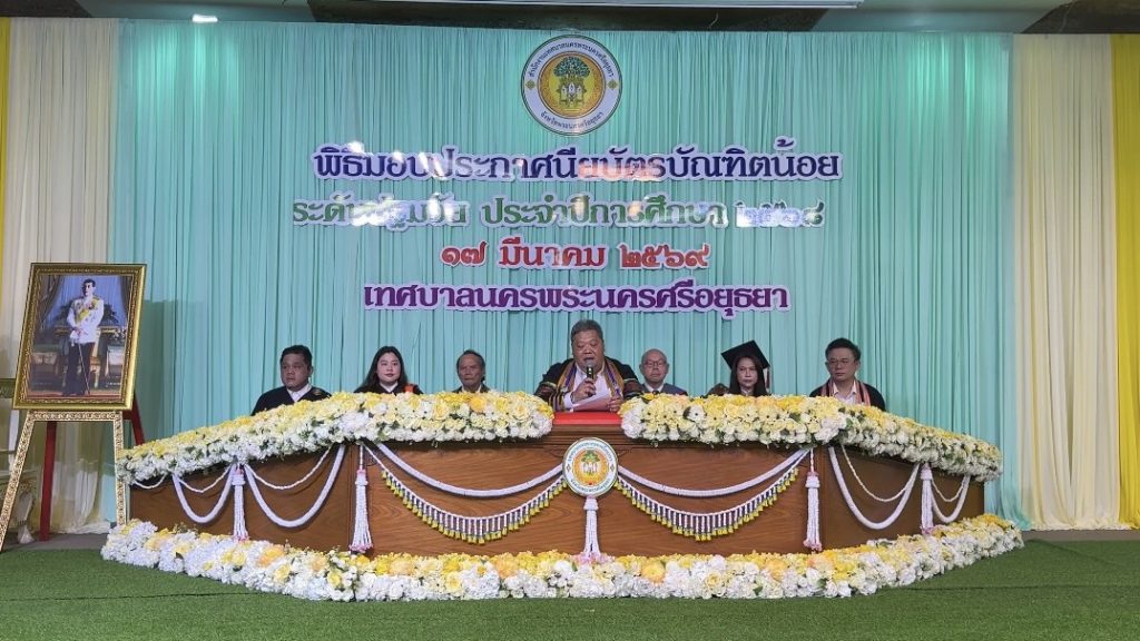 วันที่ 17 มีนาคม 2569 ที่ หอประชุมมหาวิทยาลัยราชภัฎพระนครศรีอยุธยา จังหวัดพระนครศรีอยุธยา ว่าที่ร้อยตรี ดร.สมทรง สรรพโกศลกุล นายกเทศมนตรีนครพระนครศรีอยุธยา เป็นประธานในพิธีมอบประกาศนียบัตรให้กับนักเรียน ที่จบหลักสูตรการศึกษาปฐมวัย ประจำปีการศึกษา 2568 โดยมี นางรุ่งรัศมี สรรพโกศลกุล รองนายกมนตรีเทศบาลนครพระนครศรีอยุธยา พร้อมคณะผู้บริหารเทศบาลนครพระนครศรีอยุธยา ผู้บริหารโรงเรียนในสังกัดเทศบาลและผู้ปกครอง เข้าร่วมพิธีในครั้งนี้ มีนักเรียนจากโรงเรียนในสังกัดเทศบาลนครพระนครศรีอยุธยา จำนวน 187 คน เข้ารับประกาศนียบัตร