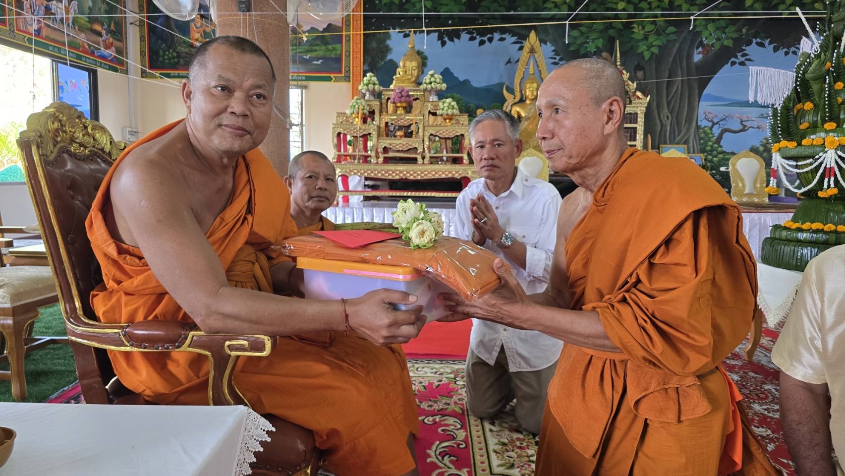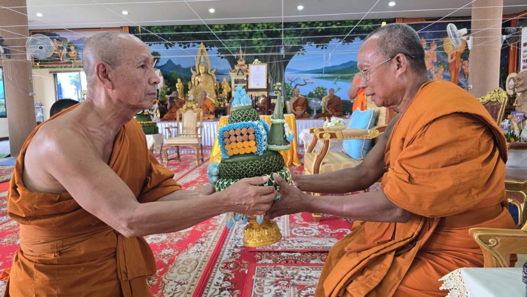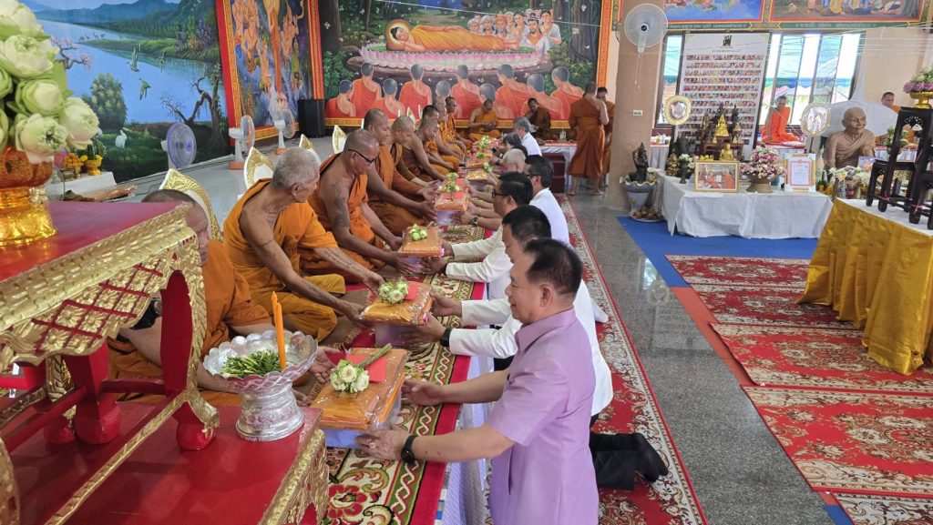 พระครูสุนทรปัญญาวิมล รองเจ้าคณะอำเภอสุวรรณภูมิ เป็นประธานฝ่ายสงฆ์ โดยในช่วงเช้าได้ประกอบพิธีห่มผ้าต้นศรีมหาโพธิ์ อายุ 200 ปี พิธีอ่านตราตั้งเจ้าอาวาส พระสงฆ์สมณศักดิ์เจริญชัยมงคลคาถา พร้อมพิธีบายศรีสู่ขวัญ ถวายเครื่องไทยธรรม และพิธีถวายต้นผ้าป่า ท่ามกลางบรรยากาศที่เปี่ยมด้วยความศรัทธาของพุทธศาสนิกชน