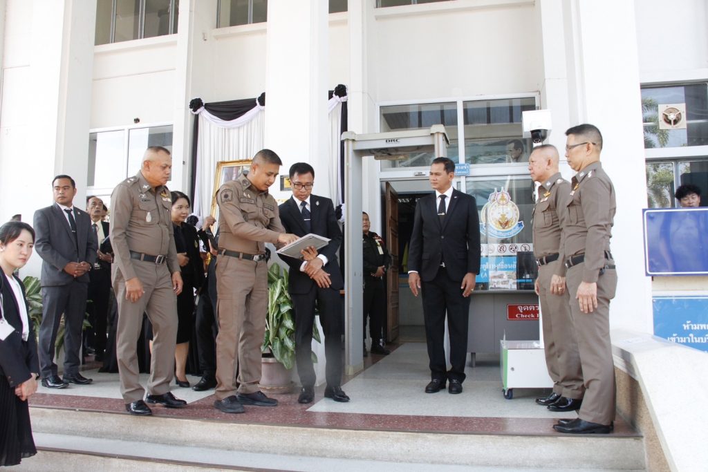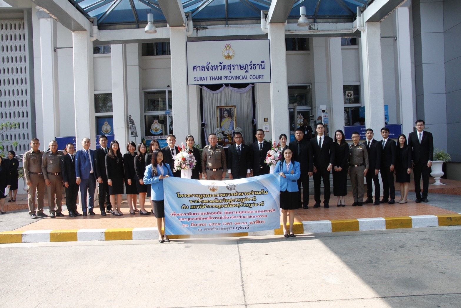 เมื่อเวลา 09.00 น.วันที่ 23 มี.ค.69 ที่หน้าศาลจังหวัดสุราษฎร์ธานี อ.เมือง จ.สุราษฎร์ธานี นาย อรุณรัตน์ ศรีพิเชียร อธิบดีผู้พิพากษาภาค 8 นายตรัสภณ ภัทรภรพงศ์ ผู้พิพากษาหัวหน้าศาลจังหวัดสุราษฎร์ธานี(ที่ปรึกษาโครงการ) พล.ต.ต.สุวัฒน์ สุขศรี ผบก.ภ.จว.สุราษฎร์ธานี พ.ต.อ.ศิริชัย สุขสาตต์ รอง ผบก.ภ.จว.สุราษฎร์ธานี พ.ต.อ.พรณรงค์ การอรชัย ผกก.สภ.เมืองสุราษฎร์ธานี พ.ต.ท.ทวีศิลป์ ลักษณะแพ่ง รอง ผกก.(ป.) สภ.เมืองสุราษฎร์ธานี พ.ต.ท.ธานี วิรวิกรม สวป.สภ.เมืองสุราษฎร์ธานี พร้อมเจ้าหน้าที่เกี่ยวข้อง ร่วมเปิดโครงการบูรณาการการทำงานร่วมกันระหว่างศาลจังหวัดสุราษฎร์ธานี และสถานีตำรวจกธรเมืองสุราษฎร์ธานี เพื่อยกระดับความปลอดภัย ติดตามบุคคลตามหมายจับและบุคคลที่มีพฤติการณ์เกี่ยวข้องกับอาชญากรรม(“โครงการเมืองสุราษฎร์ Smart City เฟส2”)