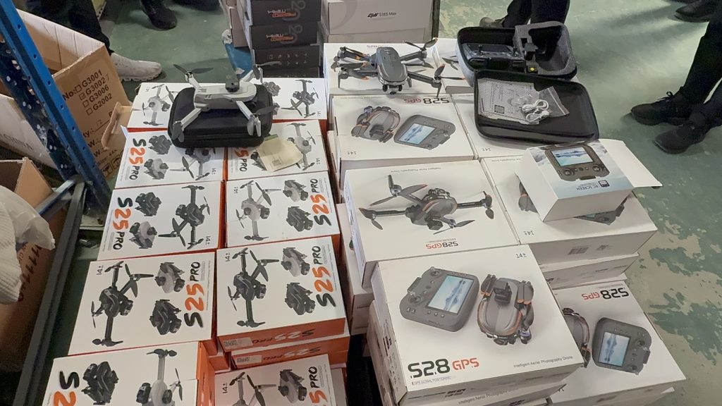 โดยนำกำลังค้นโกดังเลขที่ 1049/10 ,1169/2 ซอยพระเทพรัตโมรี6 ซอยประชาพัฒนา แขวงทับยาว เขตลาดกระบัง กรุงเทพฯ เบื้องต้นพบว่าเป็นโกดังขนาดใหญ่มีการเก็บสินค้านำเข้าจากต่างประเทศ หลากหลายประเภทที่นำเข้าจากประเทศจีน อาทิ ของใช้ประจำวันทั่วไป อาหาร อุปกรณ์อิเล็กทรอนิกส์หลายชนิด ผลการตรวจค้นสามารถตรวจยึดโดรนหลายรุ่นที่ลักลอบนำเข้าโดยผิดกฎหมาย จำนวนกว่า 2,500 ลำ รวมมูลค่ากว่า 5 ล้านบาท