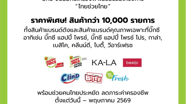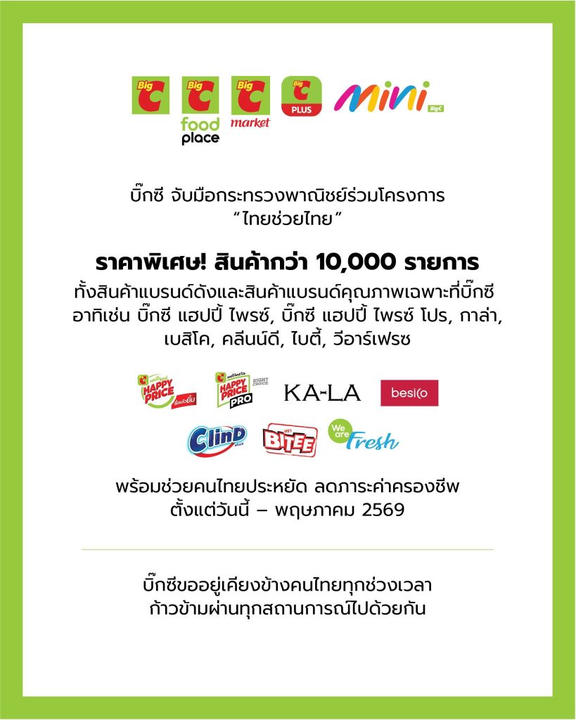 บริษัท บิ๊กซี ซูเปอร์เซ็นเตอร์ จำกัด (มหาชน) หรือ บิ๊กซี จับมือกับ กระทรวงพาณิชย์ เข้าร่วมโครงการ “ไทยช่วยไทย” จำหน่ายสินค้าราคาพิเศษ รวมจำนวนกว่า 10,000 รายการ ตั้งแต่วันนี้ – เดือนพฤษภาคม 2569 โดยมุ่งเน้นกลุ่มสินค้าอุปโภคบริโภคที่จำเป็นในชีวิตประจำวัน เพื่อให้ลูกค้าสามารถเข้าถึงสินค้าในราคาที่คุ้มค่า ตลอดจนช่วยบรรเทาผลกระทบและลดภาระค่าครองชีพของคนไทย ท่ามกลางสถานการณ์ความผันผวนของเศรษฐกิจโลก