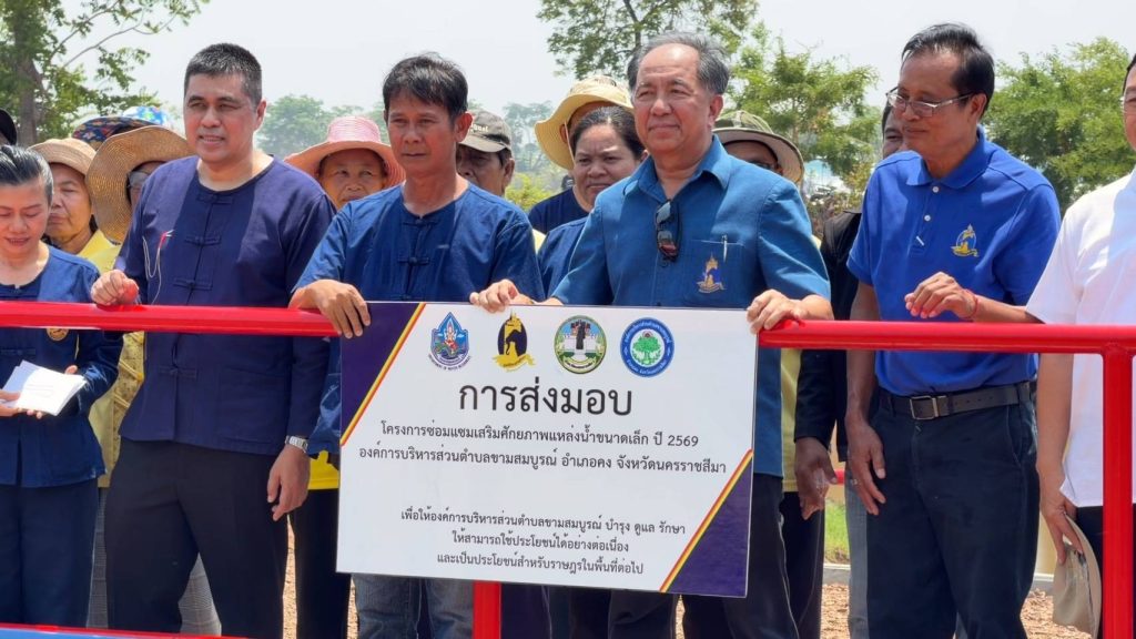 เมื่อวันพฤหัสบดีที่ 2 เมษายน 2569 ที่บ้านใหม่สามัคคี หมู่ 10 ตำบลขามสมบูรณ์ อำเภอคง จังหวัดนครราชสีมา นายกฤษฎา บุญราช ประธานกรรมการสถาบันส่งเสริมและพัฒนากิจกรรมปิดทองหลังพระ สืบสานแนวพระราชดำริ พร้อมด้วย นายอนุพงศ์ สุขสมนิตย์ ผู้ว่าราชการจังหวัดนครราชสีมา นายสุวิทย์ คำดี ที่ปรึกษาประธานกรรมการสถาบันฯ นางสาวนิชาพิชญ์ รักษาภักดี นายอำเภอคง นางสาววีราภรณ์ เกียรติชัยพัฒน ประจำสำนักเลขาธิการนายกรัฐมนตรี และคณะ ลงพื้นที่ติดตามผลการดำเนินโครงการซ่อมแซมเสริมศักยภาพแหล่งน้ำชุมชนขนาดเล็ก ประจำปี 2569 รวมถึงกิจกรรมต่อยอดขยายผลโครงการในพื้นที่อำเภอคง