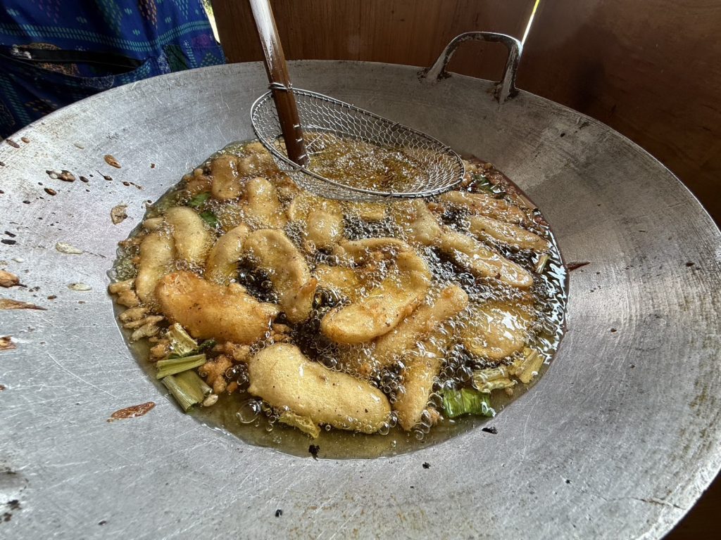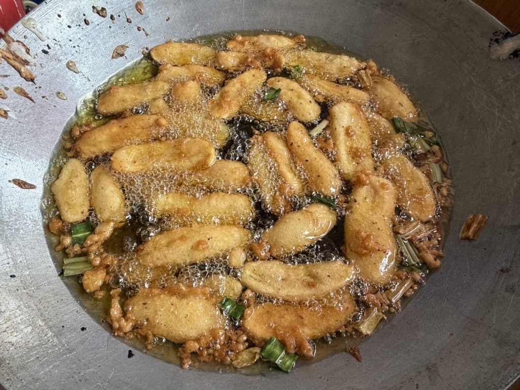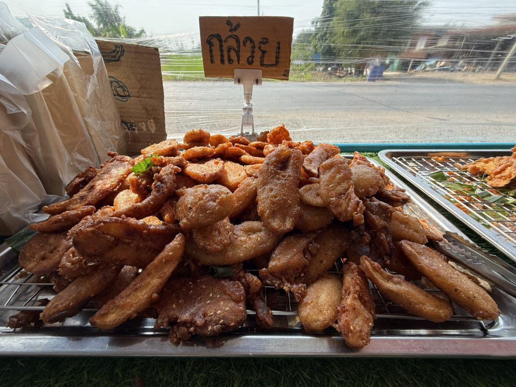 “ วันนี้ ”ชายต้น” พาชิม ได้ขับรถหลงทางผ่านมาหมู่บ้านหนองคางแมว หมู่ 7 ตำบลท่าผา อำเภอบ้านโป่ง จังหวัดราชบุรี ขับผ่านไฟแดงมา ด้วยสัญชาตญานของสื่อมวลชนสายตาอันแหลมคมเหลือบไปเห็นคนมุงอะไรกันเยอะมากจนล้นทะลักออกมาถึงนอกถนน ขับเลยไปรีบเหยียบเบรคดังเอี๊ยดดดดด จนควันออกล้อรถ รีบสับเกียร์ถอยหลังกลับมาอย่างรวดเร็ว ตอนแรกนึกว่าคนทะเลาะกันจะได้ทำข่าวเสียเลย แต่ปรากฏว่าได้มีกลิ่นหอมตลบอบอวลเหมือนของทอดลอยโชยมาตามสายลมจนทะลุกระจกรถกลิ่นความหอมโชยมาแตะปลายจมูก จนทนไม่ไหวรีบเปิดประตูลงจากรถทันที แหวกฝูงชนแทรกตัวเข้าไป โอ้โห แม่เจ้าโว้ยยย “กล้วยทอด มันทอด เผือกทอด ฟักทองทอดนั่นเอง” สีนี้เหลืองอร่ามกระแทกดวงตาแถมบอดแม้น่าลิ้มลองเหลือเกิน จนน้ำลายไหลหยดออกมาจากปาก ไม่รอช้ารีบสั่งมาชิม 100 บาท ทันที หยิบใส่ปากเสียงกัดดังกร๊วบๆๆๆไปด้วยแป้งชั้นดี กล้วยนุ่มนิ่มสะดุ้งลิ้นดีเหลือเกิน ความอร่อยไม่ต้องพูดถึงมันอร่อยยันโคนลิ้น กล้วยทอดไหลลงไปในกระเพาะอาหาร ความอร่อยยังแตะที่โคนลิ้นอยู่เลย กล้วยทอดชิ้นหนามาก แม่ค้าไม่หวงกล้วยเลย เคี้ยวเพลิน อร่อยมาก หอมกลิ่นใบเตย รสชาติหวานนิดๆ ไม่หวานมาก รสชาติของกล้วยแบบธรรมชาติติดลิ้นละมุนทีเดียว แถมมีรสชาติของกลิ่นมะพร้าวด้วย ขอบอกไม่เคยได้ลิ้มลองกล้วยทอด มันทอด เผือกทอด ฟักทองทอด รสชาติแบบนี้มาก่อนเลยถือว่ามีบุญวาสนามากที่ได้ขับรถหลงทางมา