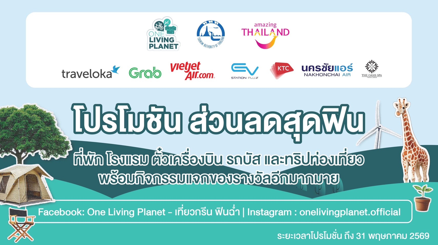 ผู้สนใจสามารถติดตามรายละเอียดโครงการ One Living Planet เที่ยวกรีน ฟินฉ่ำ รวมถึงโปรโมชันและกิจกรรมต่าง ๆ ได้ที่ Page Facebook : One Living Planet-เที่ยวกรีน ฟินฉ่ำ, IG : onelivingplanet.official