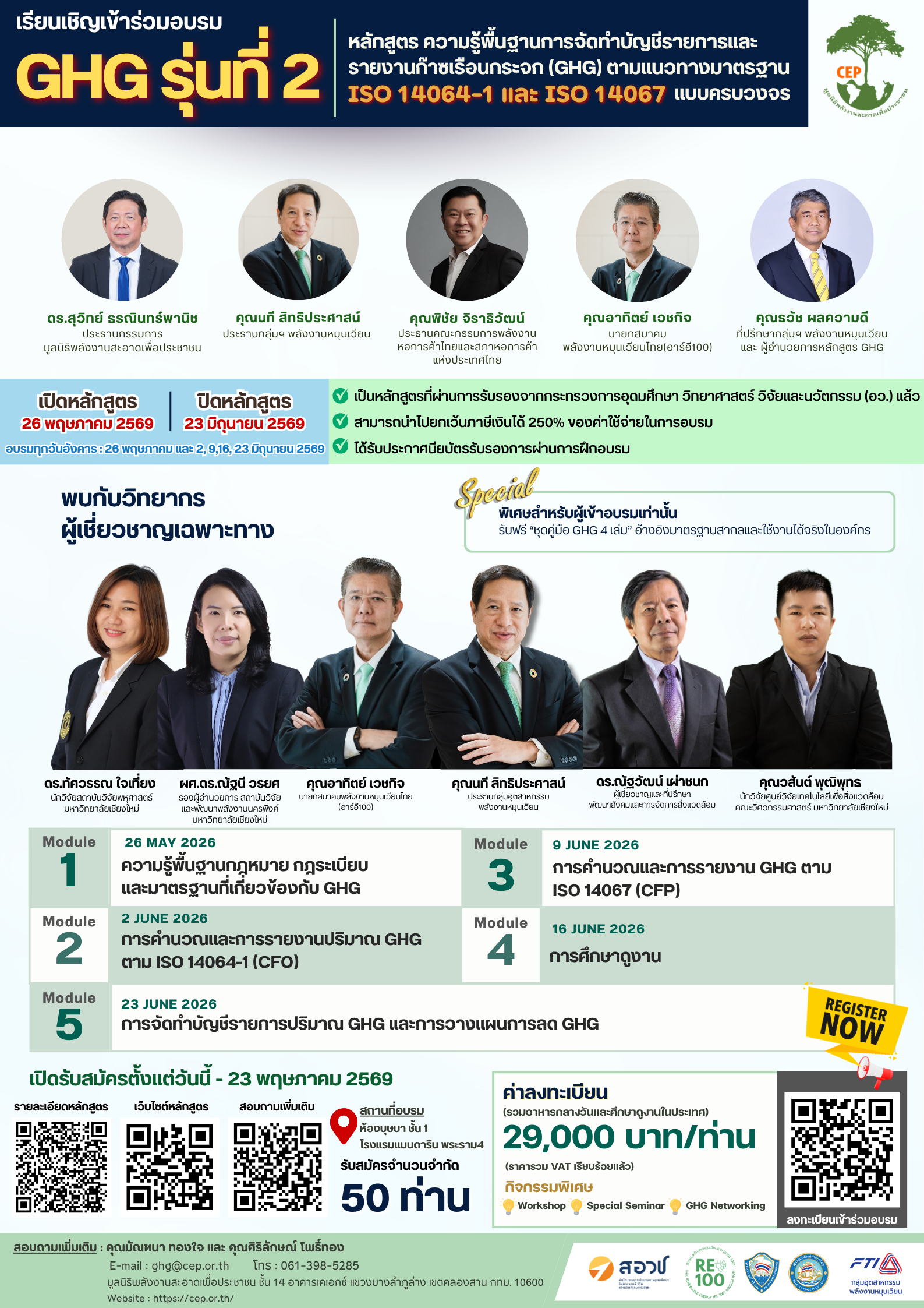 ค่าลงทะเบียนดังกล่าวรวม อาหารว่าง เครื่องดื่ม อาหารกลางวัน ตลอดหลักสูตร พร้อมกิจกรรม Networking Session และ GHG Field Trip