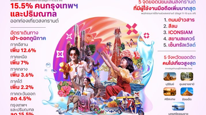 16 เมษายน 2569 – ทรู คอร์ปอเรชั่น เผยอินไซต์ “ความสุขเทศกาลสงกรานต์ 2569” ผ่านการวิเคราะห์ข้อมูล “Mobility Data” จากโครงข่ายอัจฉริยะที่ขับเคลื่อนด้วย AI สะท้อนพฤติกรรมการเดินทางและการใช้งานดิจิทัลของผู้บริโภคแบบเรียลไทม์ พบว่าเทศกาลปีนี้มีการเดินทางกระจายตัวมากขึ้นทั่วประเทศ โดยเฉพาะภูมิภาคอีสานที่เติบโตสูงสุด ขณะที่นักท่องเที่ยวต่างชาติยังคงเพิ่มขึ้นต่อเนื่อง โดยเฉพาะนักท่องเที่ยวจีนที่ครองอันดับหนึ่ง