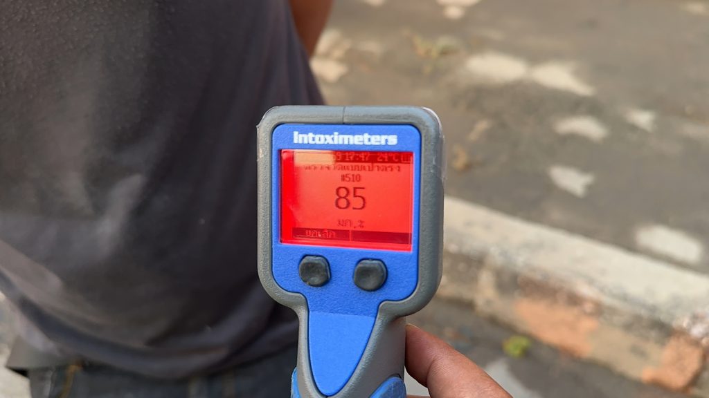 พบ นายลำดวน อายุ 42 ปี ชาวจังหวัดสระแก้ว เป็นคนขับ จากการตรวจสอบพบมีกลิ่นแอลกอฮอล์ โชยออกมาจากลมหายใจอย่างชัดเจน และเมื่อเป่าวัดแอลกอฮอล์ ได้ค่า 85 มิลลิกรัมเปอร์เซ็นต์ ซึ่งเกินกว่าที่กฎหมายกำหนด