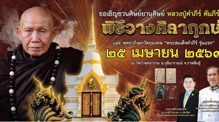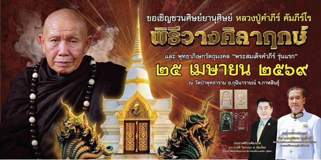 หลวงปู่คัมภีร์ คัมฺภีโร วัดป่าพุทธาราม บ้านคำกั้ง ตำบลเหล่าใหญ่ อำเภอกุฉินาราย จังหวัดกาฬสินธุ์ อริยสงฆ์เจ้า สาย ลป หงษ์ พรหมปัญโญ พระเกจิแดนอีสานใต้วัดเพชรบุรี จ. สุรินทร์ ผู้มีปฏิปทาสูงในการบำเพ็ญบุญเพื่อหลุดพ้นจากทุกข์ทั้งปวง หลวงปู่มีความกตัญญุตาต่อมารดาที่ล่วงลับ ท่านจึงได้ดำริที่จะจัดสร้างพระมหาเจดีย์ “กตัญญูคัมภีร์โร” ขึ้น มีคุณธนพร เศรษฐีมงคลญาณ ที่ปรึกษาชมรมสื่อออนไลน์ เป็นเรี่ยวแรงใหญ่ถวายงานการก่อสร้างร่วมกับสานุศิษย์ที่ใกล้ชืด โดยมีกำหนดการวางศิลาฤกษ์เกิดขึ้นในวันที่ 25 เมษายน 2569 พร้อมพิธีพุทธาภิเษก”พระสมเด็จคำภีร์” รุ่นแรก มีหลวงปู่คัมภีร์ คัมภิโร เป็นประธานสงฆ์ พร้อมด้วย เกจิคณาจารย์ร่วมพิธีพุทธาภิเษกครบครัน มีหม่อมราชวงศ์ ปณิธาน จรูญโรจน์ พร้อมด้วย ดร.อาณัติ วัชรางกุร ณ เชียงใหม่ ที่ปรึษากิตตมศักดิ์คณะกรรมาธิการท่องเที่ยวและกีฬา วุฒิสภา ที่ปรึกษาชมรมสื่อออนไลน์ เป็นประธานพิธีวางศิลาฤกษ์