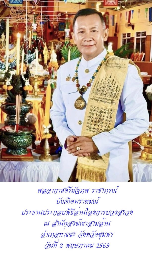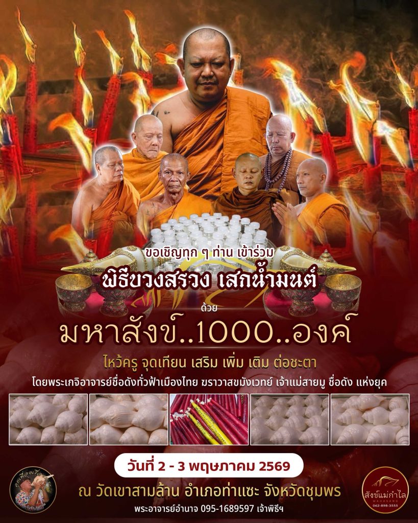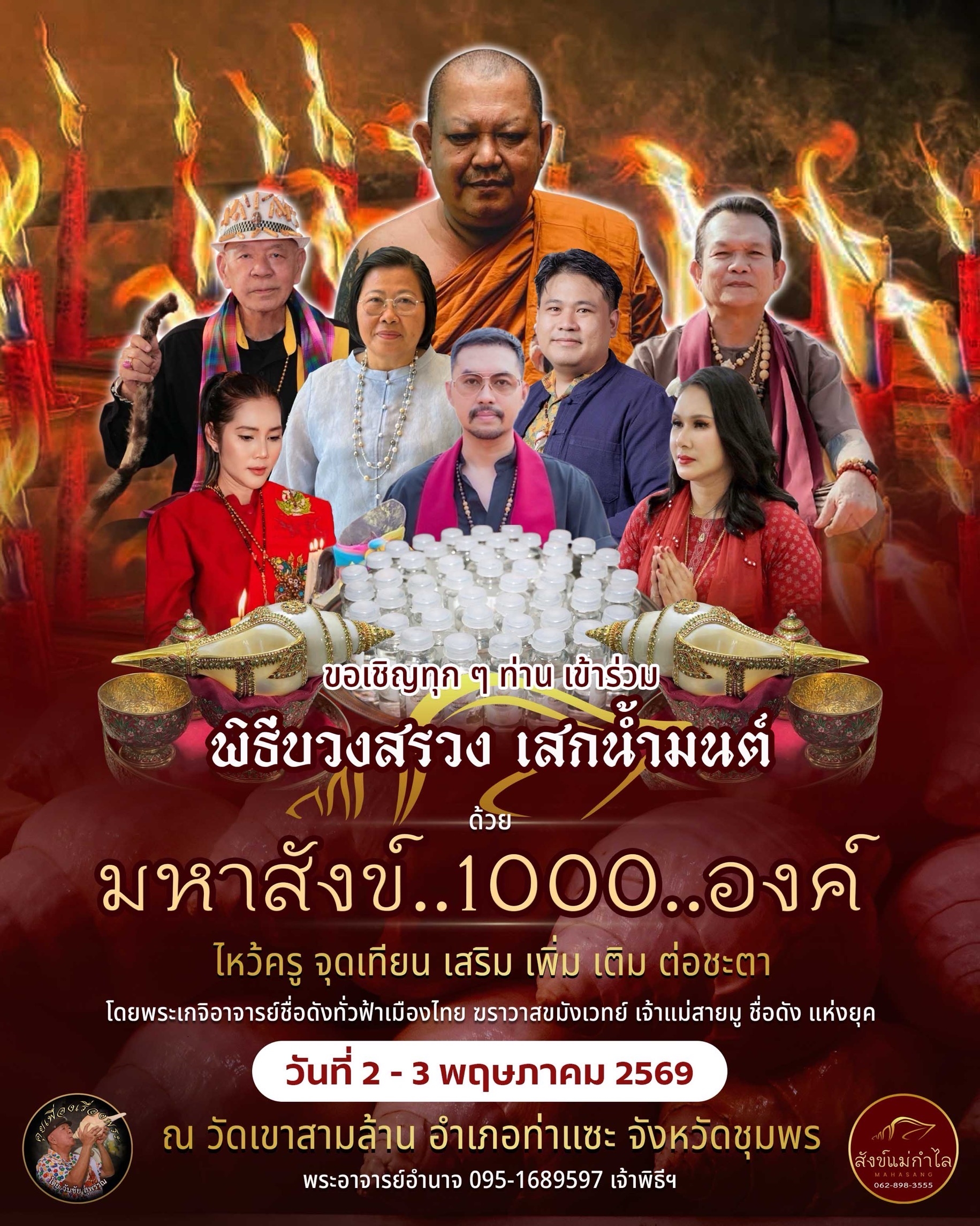 จังหวัดชุมพร เตรียมจัดงานพิธีบวงสรวงและเสกน้ำมนต์ครั้งยิ่งใหญ่ “มหาสังข์ 1,000 องค์” ระหว่างวันที่ 2 – 3 พฤษภาคม 2569 โดยมีพระเกจิอาจารย์ชื่อดังจากทั่วประเทศร่วมประกอบพิธี เพื่อความเป็นสิริมงคลแก่ประชาชนผู้เข้าร่วมงาน