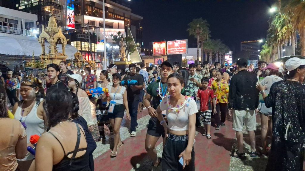 ส่วนบริเวณชายหาดตั้งแต่แยกพัทยาเหนือจนถึงทางเข้า walking street มีนักท่องเที่ยวจำนวนมากมาเล่นน้ำชายหาดกันอย่างคึกคักทั้งช่วงเวทีคอนเสิร์ต และตามบาร์เบียร์ต่างๆ ที่ตั้งจุดเล่นน้ำให้กับพนักงานและแขกที่มามาเที่ยว ส่วนตามถนน ก็จะมีนักท่องเที่ยวชาวไทยและชาวต่างชาติ เดินเล่นฉีดน้ำกันอย่างสนุกสนาน
