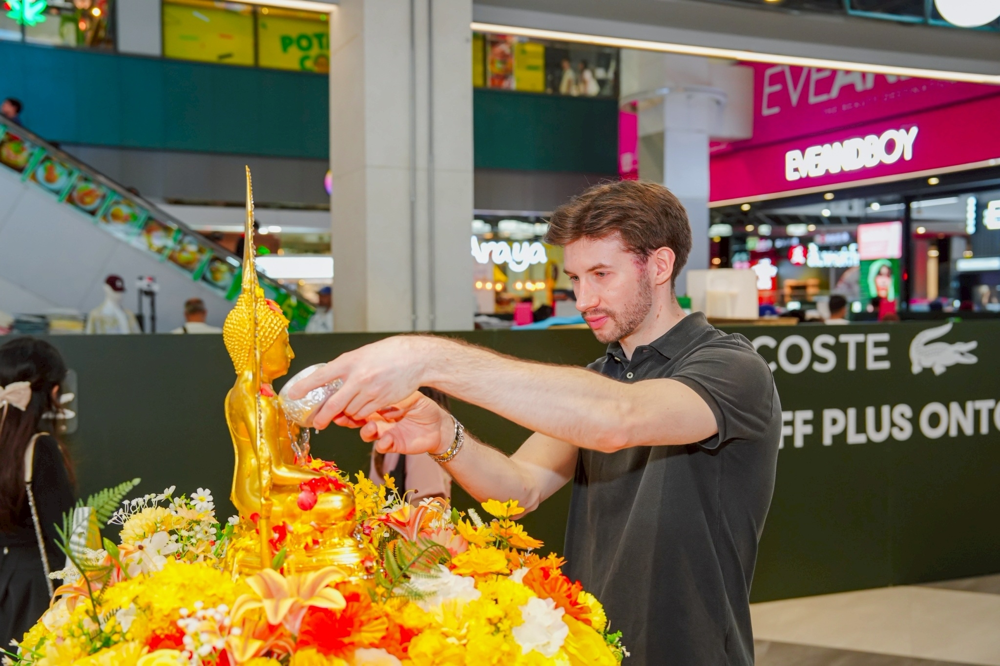 นอกจากนี้เพื่อสืบสานประเพณีอันดีงามของไทย ศูนย์การค้าเอ็ม บี เค เซ็นเตอร์ ได้อัญเชิญพระพุทธรูปองค์สมเด็จจากวัดท่าซุง มาประดิษฐานให้พุทธศาสนิกชนและนักท่องเที่ยวได้ร่วมสรงน้ำพระ เพื่อความเป็นสิริมงคลเนื่องในโอกาสขึ้นปีใหม่ไทย ท่ามกลางบรรยากาศที่อบอวลไปด้วยความสงบ งดงาม และเปี่ยมด้วยคุณค่าทางจิตใจ ควบคู่ความสนุกสนานจากขบวนรำวงกลองยาว รื่นเริง เถลิงศกใหม่ ที่มาร่วมสร้างสีสันทั่วศูนย์การค้าฯ โดยมีการต้อนรับลูกค้า ทั้งชาวไทยและทัวริสต์ด้วยพวงมาลัยคล้องคอและ พัดสาน MBK (MBK Bamboo Fan Limited Edition) ของที่ระลึกสุดเอ็กซ์คลูซีฟสำหรับนักท่องเที่ยวจากทั่วโลก โดยผลงานหัตถกรรมจากชุมชนบ้านแพรก จังหวัดพระนครศรีอยุธยา ซึ่งทาง เอ็ม บี เค เซ็นเตอร์ ได้เชื่อมภูมิปัญญาไทยสู่ “Global Souvenir” ที่สร้างความประทับใจตลอดเส้นทาง ท่ามกลางความสนใจจากลูกค้าคนไทย และ นักท่องเที่ยวต่างชาติที่ร่วมปรบมือและรำวงไปกับจังหวะกลองยาวอย่างคึกคัก