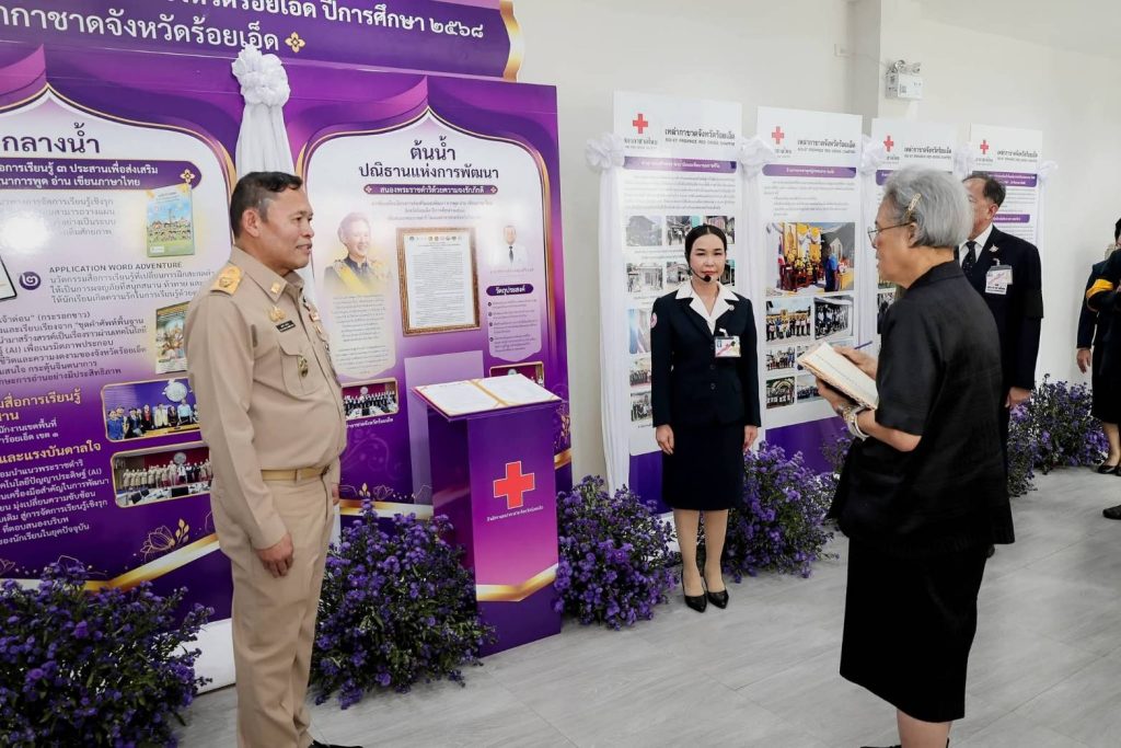 จากนั้น ทอดพระเนตรนิทรรศการภารกิจของเหล่ากาชาดจังหวัดร้อยเอ็ด ในการช่วยเหลือประชาชนด้านต่าง ๆ อาทิ การบรรเทาทุกข์ผู้ประสบภัย การรับบริจาคโลหิต และทอดพระเนตรการดำเนินงานตามโครงการส่งเสริมและพัฒนาการพูด อ่าน เขียน ภาษาไทย ของเหล่ากาชาดจังหวัดร้อยเอ็ด ในการแก้ไขปัญหานักเรียนระดับประถมศึกษาที่มีปัญหาการเรียนภาษาไทย ซึ่งดำเนินงานสนองพระราชดำริของ สมเด็จพระกนิษฐาธิราชเจ้า กรมสมเด็จพระเทพรัตนราชสุดาฯ สยามบรมราชกุมารี ในฐานะผู้อำนวยการ สภากาชาดไทย