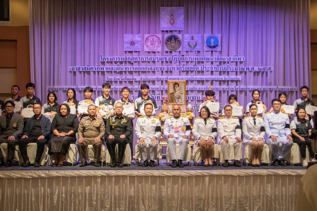 วันศุกร์ที่ 24 เมษายน 2569 เวลา 17.00 น. ณ ห้องประชุมประดับดาว โรงแรมเพชรรัชต์การ์เด้น ตำบลเหนือเมือง อำเภอเมืองร้อยเอ็ด จังหวัดร้อยเอ็ด นายชัชวาลย์ เบญจสิริวงศ์ ผู้ว่าราชการจังหวัดร้อยเอ็ด มอบหมายให้ นายพิชัยยา ตุระซอง รองผู้ว่าราชการจังหวัดร้อยเอ็ด ร่วมพิธีปิดโครงการหลักสูตรการอบรมเชิงปฏิบัติการเพื่อพัฒนาจิตอาสากีฬา (อาสาสมัครกีฬาและผู้นำออกกำลังกาย) จังหวัดร้อยเอ็ด ประจำปีงบประมาณ พ.ศ. 2569 โดยมี พันโทสมานมิตร พัฒนา ประจำสำนักพระราชวังพิเศษ ระดับ 10 ผู้แทนหน่วยราชการในพระองค์ เป็นประธานในพิธีมอบวุฒิบัตร เบื้องหน้าพระบรมฉายาลักษณ์พระบาทสมเด็จพระเจ้าอยู่หัว และทำพิธีปิดโครงการหลักสูตรการอบรมเชิงปฏิบัติการเพื่อพัฒนาจิตอาสากีฬา (อาสาสมัครกีฬาและผู้นำออกกำลังกาย) จังหวัดร้อยเอ็ด ประจำปีงบประมาณ พ.ศ. 2569 พร้อมด้วย หัวหน้าส่วนราชการ หน่วยงานที่เกี่ยวข้อง เข้าร่วมพิธีฯ
