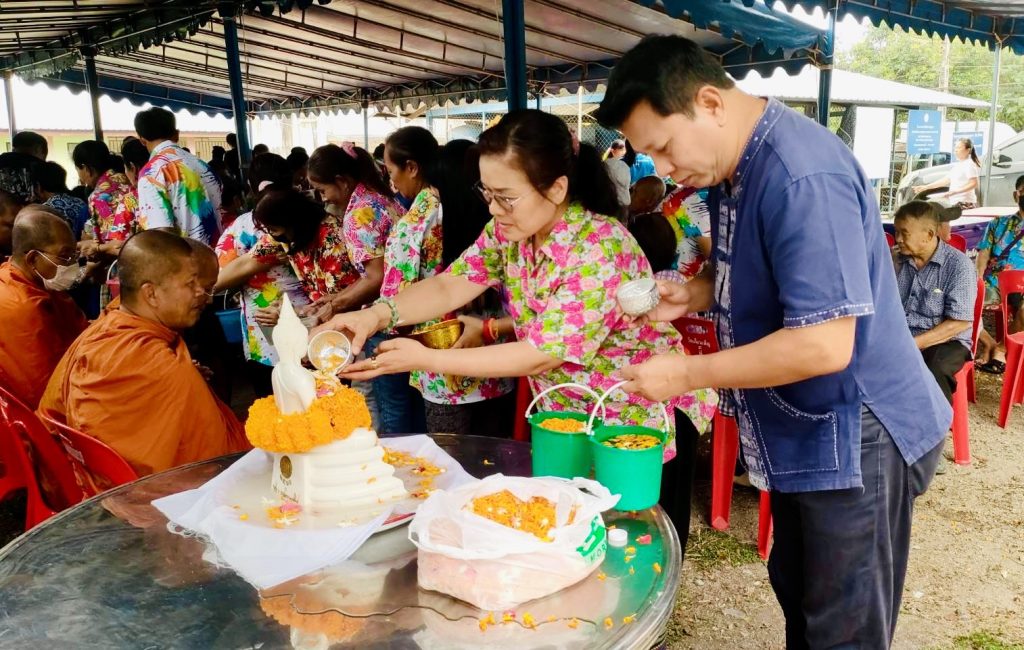 ต่อด้วยพิธีที่เปี่ยมไปด้วยรอยยิ้มและคราบน้ำตาแห่งความปิติ คือ “พิธีรดน้ำขอพรผู้สูงอายุ” เนื่องในเทศกาลสงกรานต์ นำโดย นายชูศักดิ์ พรนิมิตทรัพย์ ผู้ใหญ่บ้านหมู่ 9 พร้อมการมอบข้าวสารอาหารแห้งเพื่อเป็นขวัญและกำลังใจแก่ผู้สูงวัยในหมู่บ้าน ตอกย้ำการดูแลกันและกันของคนในชุมชนที่ “ไม่ทิ้งใครไว้ข้างหลัง”