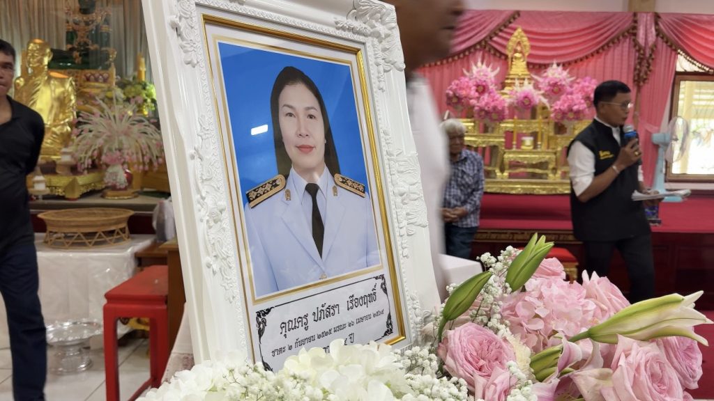 บรรยากาศภายในงานเต็มไปด้วยความโศกเศร้า มีครอบครัว ญาติ เพื่อนครู และลูกศิษย์ ทยอยเดินทางมาร่วมไว้อาลัยและแสดงความเสียใจอย่างต่อเนื่อง