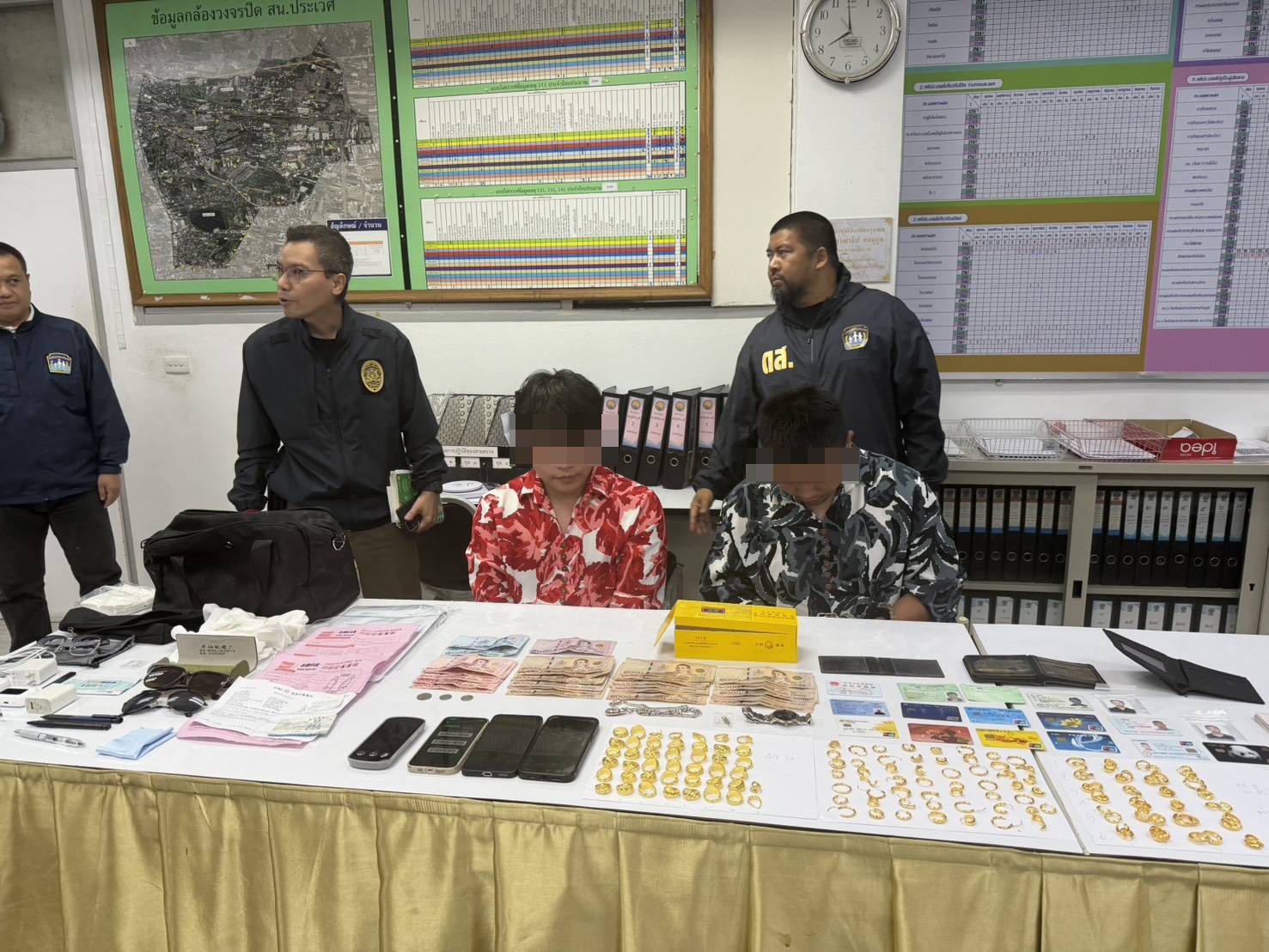 จนกระทั่งในเวลา 18.00 น. ของวันเดียวกัน เจ้าหน้าที่ตำรวจสามารถจับกุมตัว นายโจว ฉิน เทา อายุ 27 ปี สัญชาติจีน และ นายซง เฮาหลง อายุ 18 ปี สัญชาติจีน ได้บริเวณในซอยสุขุมวิท 77 กรุงเทพฯ พร้อมรถคันก่อเหตุ ขณะหลบหนี พร้อมของกลางเป็นแหวนทองคำ จำนวน 44 วง น้ำหนักรวม 156 กรัม และต่างหูทองคำ 102 ชิ้น น้ำหนักรวม 112 กรัม หรือประมาณเกือบ 18 บาท ครบถ้วน ปิดฉากการหลบหนีข้ามจังหวัดในระยะเวลาเพียง 8 ชั่วโมง